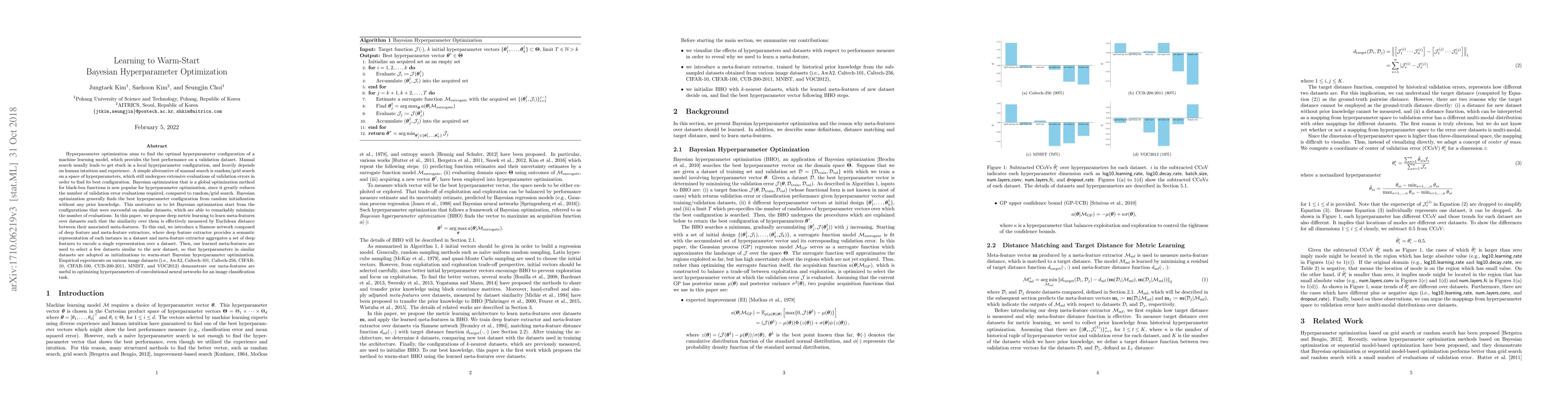 This paper proposes a method to warm-start Bayesian hyperparameter optimization using deep metric learning. It introduces a Siamese network to learn meta-features that measure dataset similarity, enabling the selection of similar datasets to initialize hyperparameters, thereby reducing the number of evaluations required.