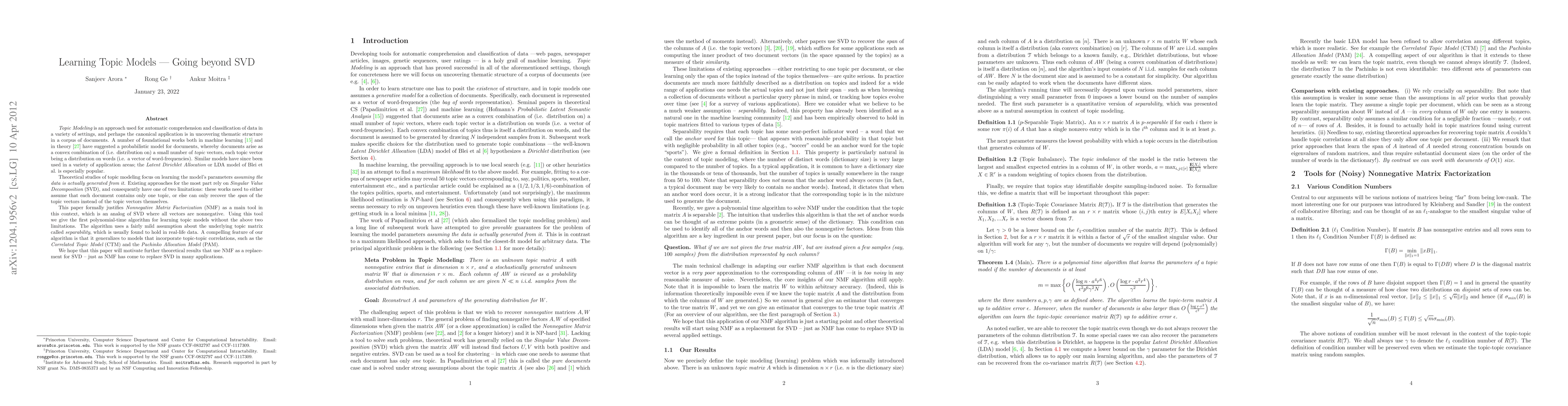 Topic Modeling is an approach used for automatic comprehension and classification of data in a variety of settings, and perhaps the canonical application is in uncovering thematic structure in a corpus of documents. A number of foundational works both in machine learning and in theory have suggested a probabilistic model for documents, whereby documents arise as a convex combination of (i.e. distribution on) a small number of topic vectors, each topic vector being a distribution on words (i.e. a vector of word-frequencies). Similar models have since been used in a variety of application areas; the Latent Dirichlet Allocation or LDA model of Blei et al. is especially popular. Theoretical studies of topic modeling focus on learning the model's parameters assuming the data is actually generated from it. Existing approaches for the most part rely on Singular Value Decomposition(SVD), and consequently have one of two limitations: these works need to either assume that each document contains only one topic, or else can only recover the span of the topic vectors instead of the topic vectors themselves. This paper formally justifies Nonnegative Matrix Factorization(NMF) as a main tool in this context, which is an analog of SVD where all vectors are nonnegative. Using this tool we give the first polynomial-time algorithm for learning topic models without the above two limitations. The algorithm uses a fairly mild assumption about the underlying topic matrix called separability, which is usually found to hold in real-life data. A compelling feature of our algorithm is that it generalizes to models that incorporate topic-topic correlations, such as the Correlated Topic Model and the Pachinko Allocation Model. We hope that this paper will motivate further theoretical results that use NMF as a replacement for SVD - just as NMF has come to replace SVD in many applications.