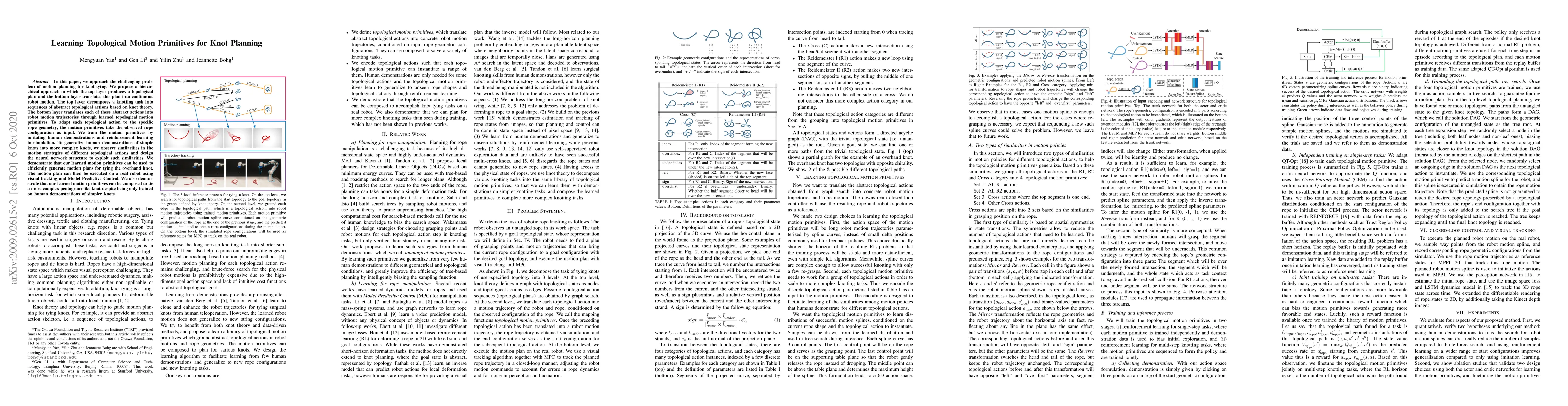 This paper proposes a hierarchical method for robot motion planning in knot tying, where a top layer generates topological plans and a bottom layer translates these into robot motions using learned topological motion primitives. The approach successfully generalizes from simple to complex knots through imitation learning and reinforcement learning.