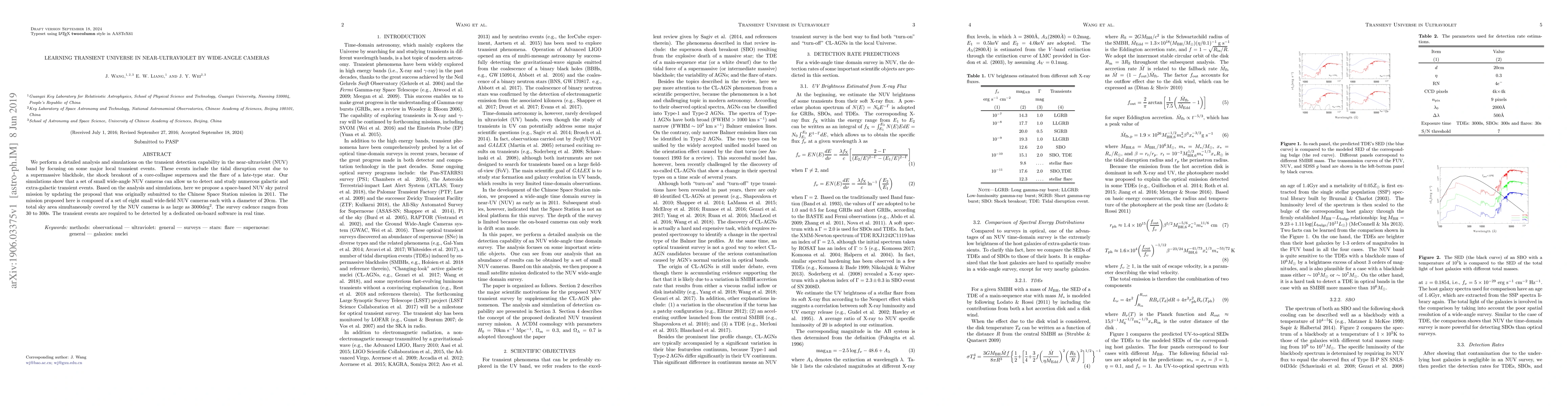 We perform a detailed analysis and simulations on the transient detection capability in the near-ultraviolet (NUV) band by focusing on some major local transient events. These events include the tidal disruption event due to a supermassive blackhole, the shock breakout of a core-collapse supernova and the flare of a late-type star. Our simulations show that a set of small wide-angle NUV cameras can allow us to detect and study numerous galactic and extra-galactic transient events. Based on the analysis and simulations, here we propose a space-based NUV sky patrol mission by updating the proposal that was originally submitted to the Chinese Space Station mission in 2011. The mission proposed here is composed of a set of eight small wide-field NUV cameras each with a diameter of 20cm. The total sky area simultaneously covered by the NUV cameras is as large as 3000$\mathrm{deg^2}$. The survey cadence ranges from 30 to 300s. The transient events are required to be detected by a dedicated on-board software in real time.