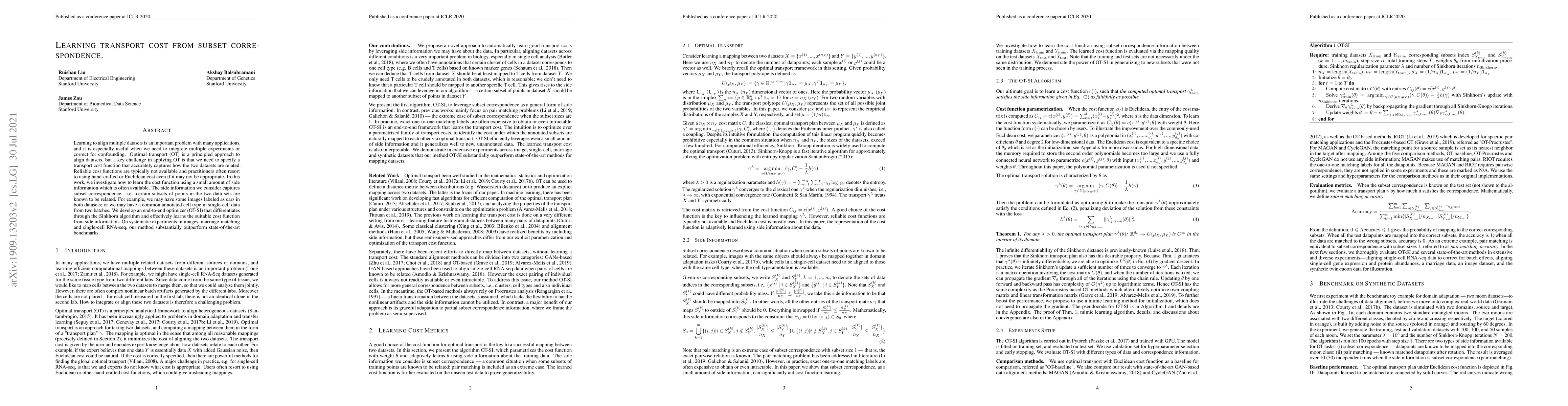 Learning to align multiple datasets is an important problem with many applications, and it is especially useful when we need to integrate multiple experiments or correct for confounding. Optimal transport (OT) is a principled approach to align datasets, but a key challenge in applying OT is that we need to specify a transport cost function that accurately captures how the two datasets are related. Reliable cost functions are typically not available and practitioners often resort to using hand-crafted or Euclidean cost even if it may not be appropriate. In this work, we investigate how to learn the cost function using a small amount of side information which is often available. The side information we consider captures subset correspondence -- i.e. certain subsets of points in the two data sets are known to be related. For example, we may have some images labeled as cars in both datasets; or we may have a common annotated cell type in single-cell data from two batches. We develop an end-to-end optimizer (OT-SI) that differentiates through the Sinkhorn algorithm and effectively learns the suitable cost function from side information. On systematic experiments in images, marriage-matching and single-cell RNA-seq, our method substantially outperform state-of-the-art benchmarks.