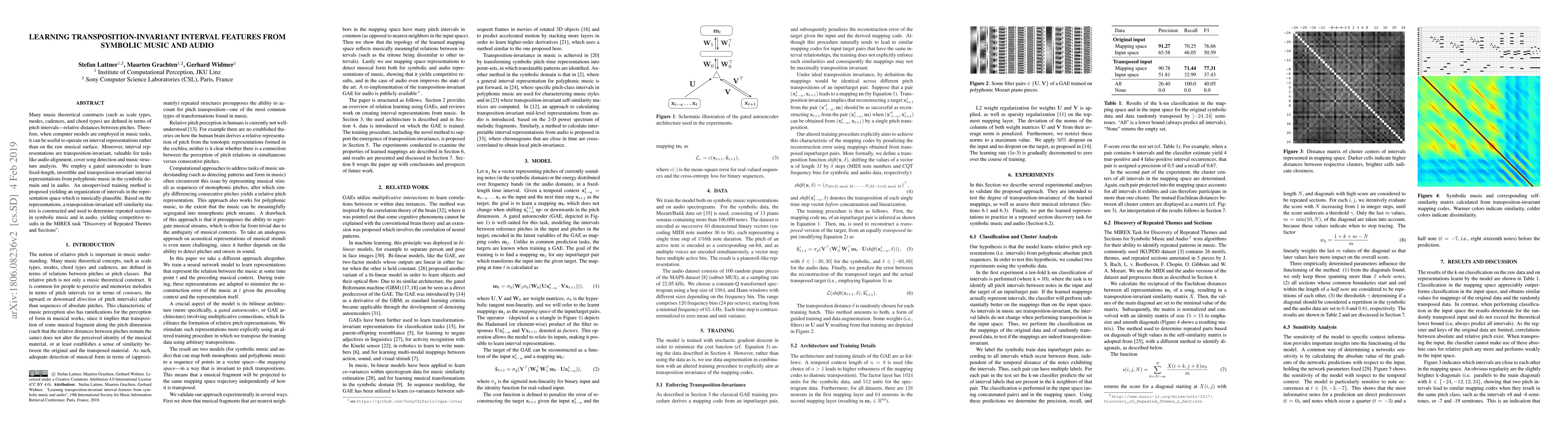 This paper proposes a method to learn transposition-invariant interval features from both symbolic music and audio using a gated autoencoder. The learned representations enable the detection of repeated sections in music, achieving competitive results in the MIREX task.