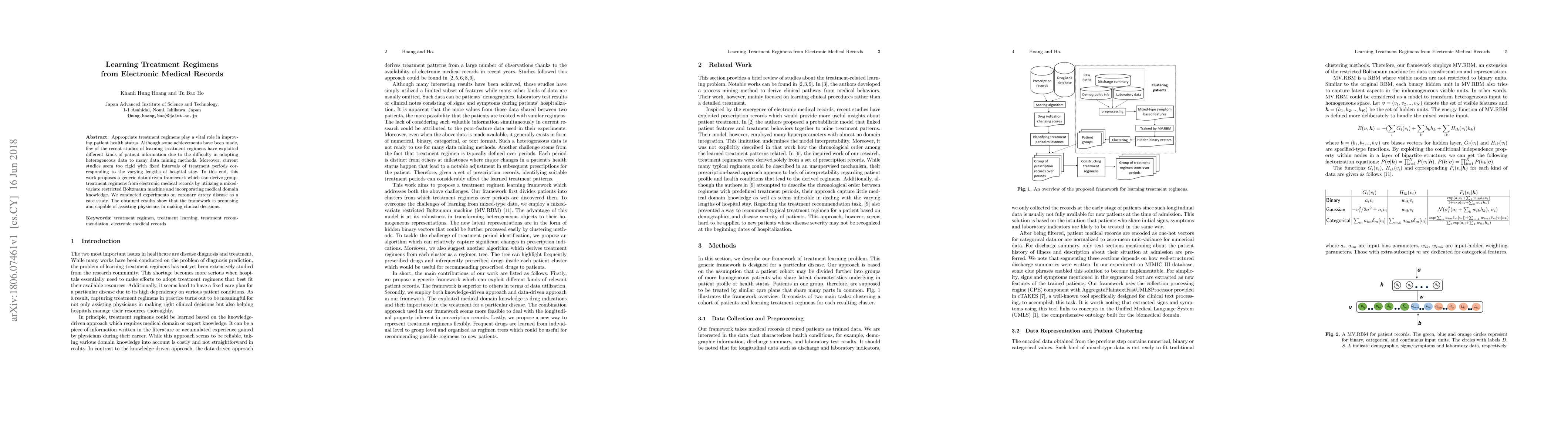 Appropriate treatment regimens play a vital role in improving patient health status. Although some achievements have been made, few of the recent studies of learning treatment regimens have exploited different kinds of patient information due to the difficulty in adopting heterogeneous data to many data mining methods. Moreover, current studies seem too rigid with fixed intervals of treatment periods corresponding to the varying lengths of hospital stay. To this end, this work proposes a generic data-driven framework which can derive group-treatment regimens from electronic medical records by utilizing a mixed-variate restricted Boltzmann machine and incorporating medical domain knowledge. We conducted experiments on coronary artery disease as a case study. The obtained results show that the framework is promising and capable of assisting physicians in making clinical decisions.
