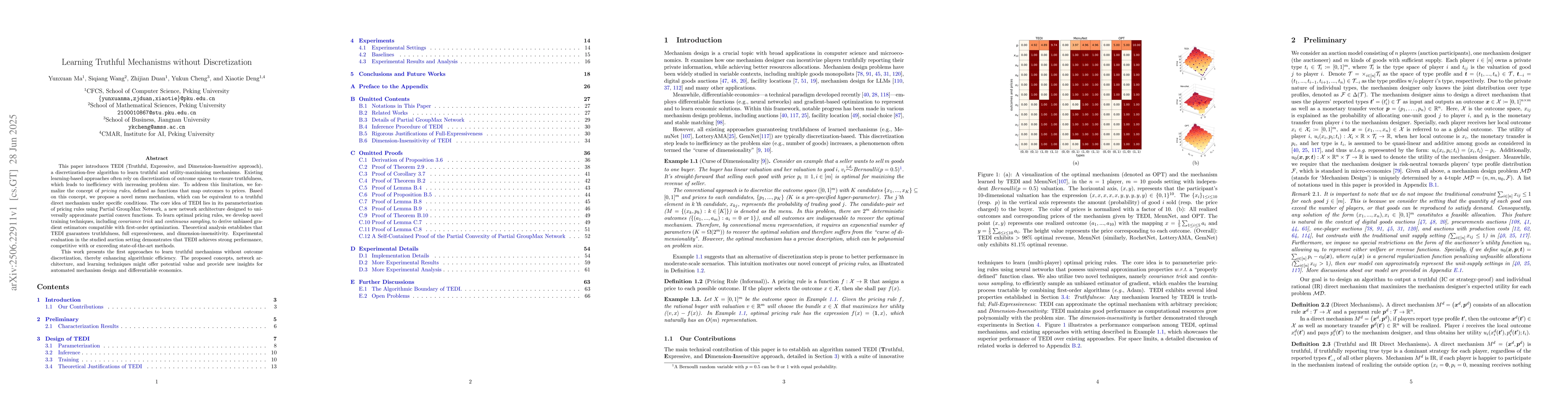 The paper introduces TEDI, a discretization-free algorithm for learning truthful and utility-maximizing mechanisms, utilizing Partial GroupMax Network to parameterize pricing rules and novel training techniques for unbiased gradient estimation.
