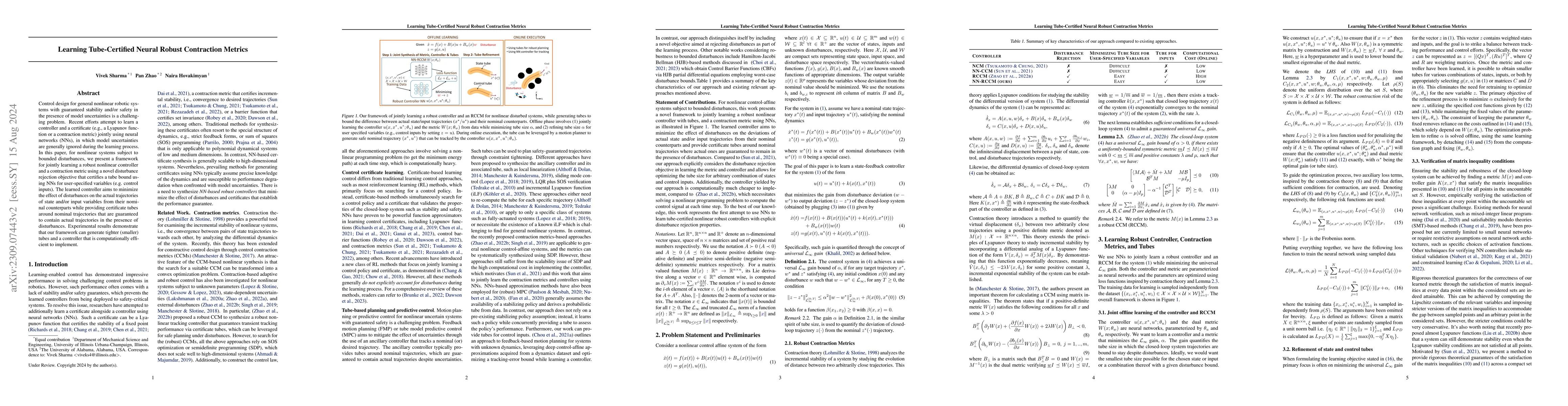 This paper presents a framework for learning a robust nonlinear controller and a contraction metric for nonlinear robotic systems using neural networks, focusing on minimizing disturbance effects and ensuring stability with guaranteed safety bounds. Experimental results show improved performance in generating tighter stability tubes and efficient controller implementation.