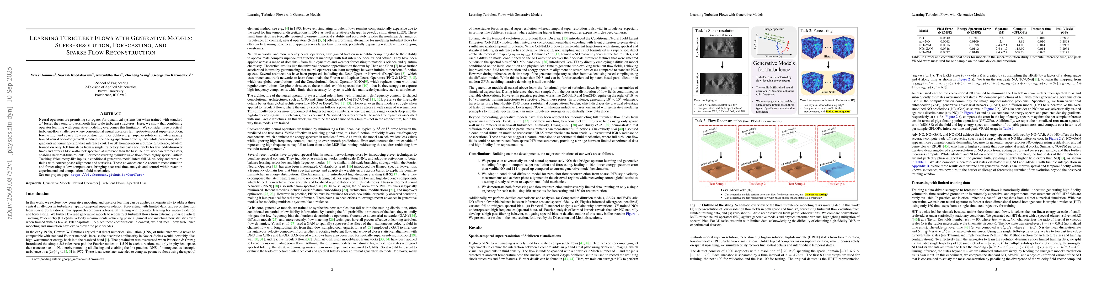 Neural operators are promising surrogates for dynamical systems but when trained with standard L2 losses they tend to oversmooth fine-scale turbulent structures. Here, we show that combining operator learning with generative modeling overcomes this limitation. We consider three practical turbulent-flow challenges where conventional neural operators fail: spatio-temporal super-resolution, forecasting, and sparse flow reconstruction. For Schlieren jet super-resolution, an adversarially trained neural operator (adv-NO) reduces the energy-spectrum error by 15x while preserving sharp gradients at neural operator-like inference cost. For 3D homogeneous isotropic turbulence, adv-NO trained on only 160 timesteps from a single trajectory forecasts accurately for five eddy-turnover times and offers 114x wall-clock speed-up at inference than the baseline diffusion-based forecasters, enabling near-real-time rollouts. For reconstructing cylinder wake flows from highly sparse Particle Tracking Velocimetry-like inputs, a conditional generative model infers full 3D velocity and pressure fields with correct phase alignment and statistics. These advances enable accurate reconstruction and forecasting at low compute cost, bringing near-real-time analysis and control within reach in experimental and computational fluid mechanics. See our project page: https://vivekoommen.github.io/Gen4Turb/