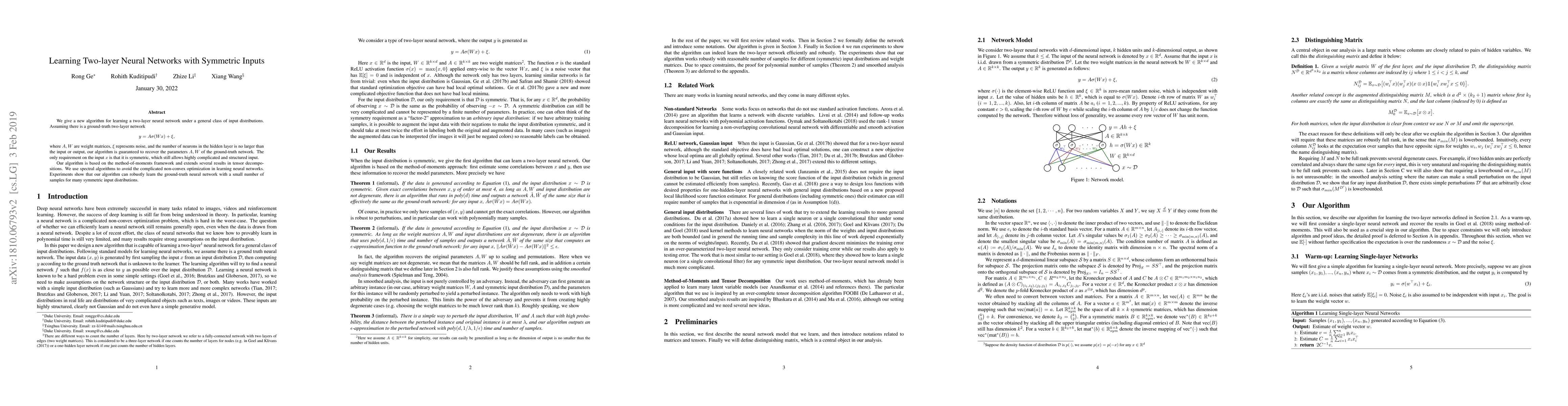 We give a new algorithm for learning a two-layer neural network under a general class of input distributions. Assuming there is a ground-truth two-layer network $$ y = A \sigma(Wx) + \xi, $$ where $A,W$ are weight matrices, $\xi$ represents noise, and the number of neurons in the hidden layer is no larger than the input or output, our algorithm is guaranteed to recover the parameters $A,W$ of the ground-truth network. The only requirement on the input $x$ is that it is symmetric, which still allows highly complicated and structured input. Our algorithm is based on the method-of-moments framework and extends several results in tensor decompositions. We use spectral algorithms to avoid the complicated non-convex optimization in learning neural networks. Experiments show that our algorithm can robustly learn the ground-truth neural network with a small number of samples for many symmetric input distributions.