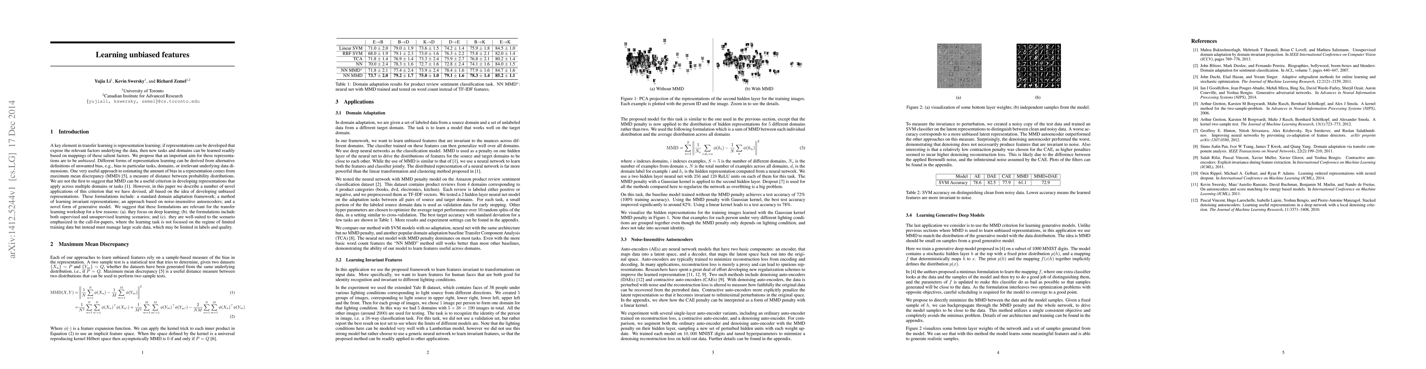 A key element in transfer learning is representation learning; if representations can be developed that expose the relevant factors underlying the data, then new tasks and domains can be learned readily based on mappings of these salient factors. We propose that an important aim for these representations are to be unbiased. Different forms of representation learning can be derived from alternative definitions of unwanted bias, e.g., bias to particular tasks, domains, or irrelevant underlying data dimensions. One very useful approach to estimating the amount of bias in a representation comes from maximum mean discrepancy (MMD) [5], a measure of distance between probability distributions. We are not the first to suggest that MMD can be a useful criterion in developing representations that apply across multiple domains or tasks [1]. However, in this paper we describe a number of novel applications of this criterion that we have devised, all based on the idea of developing unbiased representations. These formulations include: a standard domain adaptation framework; a method of learning invariant representations; an approach based on noise-insensitive autoencoders; and a novel form of generative model.