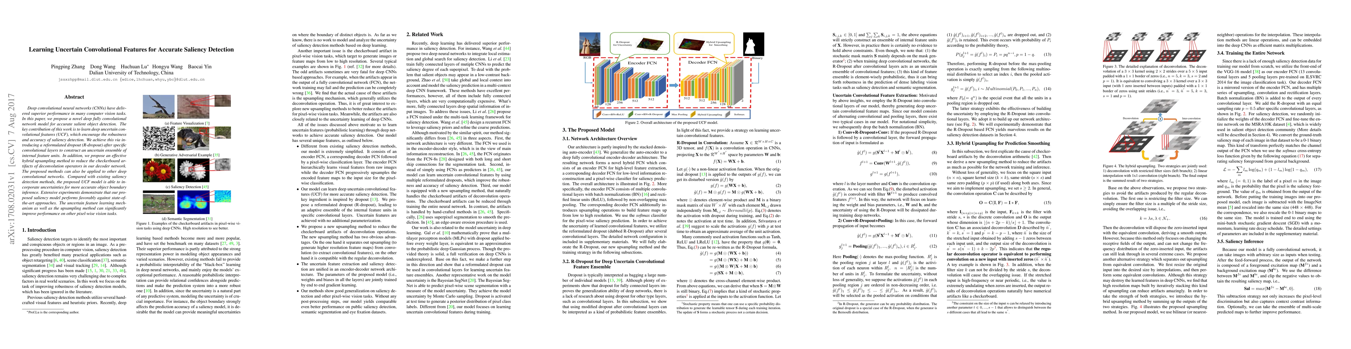 This paper proposes a deep convolutional network model for salient object detection that learns uncertain convolutional features (UCF) to enhance robustness and accuracy. It employs reformulated dropout and a hybrid upsampling method to mitigate artifacts, achieving superior performance compared to existing methods.