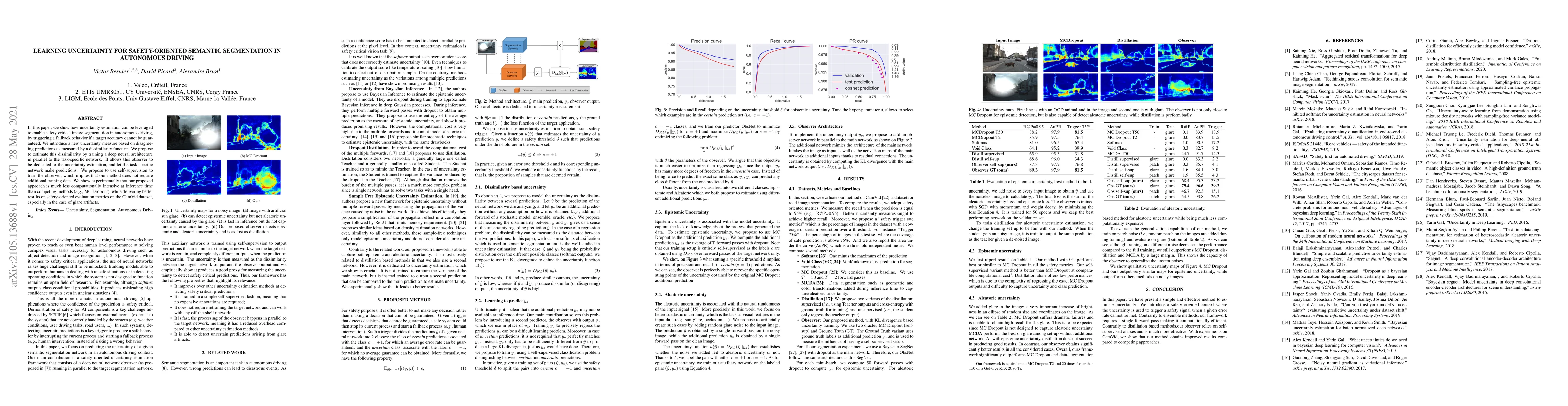 In this paper, we show how uncertainty estimation can be leveraged to enable safety critical image segmentation in autonomous driving, by triggering a fallback behavior if a target accuracy cannot be guaranteed. We introduce a new uncertainty measure based on disagreeing predictions as measured by a dissimilarity function. We propose to estimate this dissimilarity by training a deep neural architecture in parallel to the task-specific network. It allows this observer to be dedicated to the uncertainty estimation, and let the task-specific network make predictions. We propose to use self-supervision to train the observer, which implies that our method does not require additional training data. We show experimentally that our proposed approach is much less computationally intensive at inference time than competing methods (e.g. MCDropout), while delivering better results on safety-oriented evaluation metrics on the CamVid dataset, especially in the case of glare artifacts.
