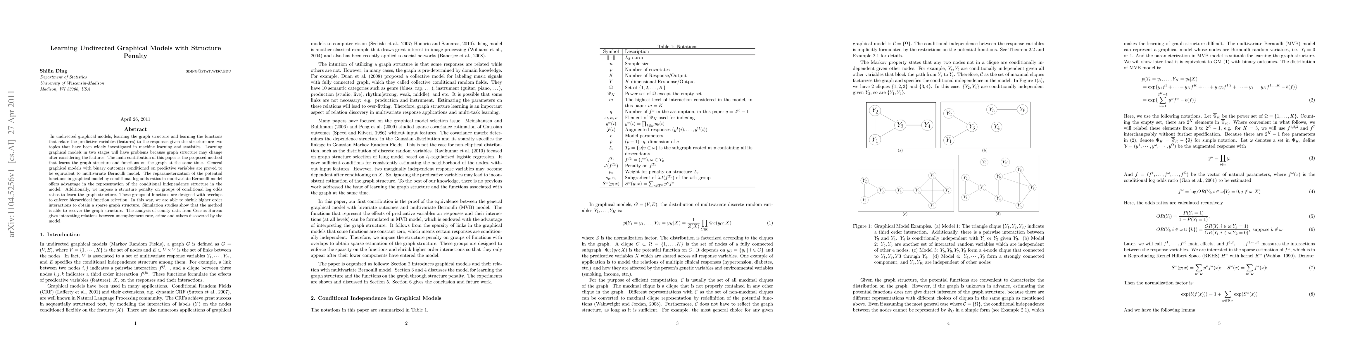 This paper proposes a method to simultaneously learn the graph structure and functions in undirected graphical models, addressing the issue of changing graph structure when learning in stages. The method uses conditional log odds ratios and a structure penalty to enforce hierarchical function selection, resulting in sparse graph structures, as demonstrated by successful recovery in simulations and insightful findings in county-level Census data.