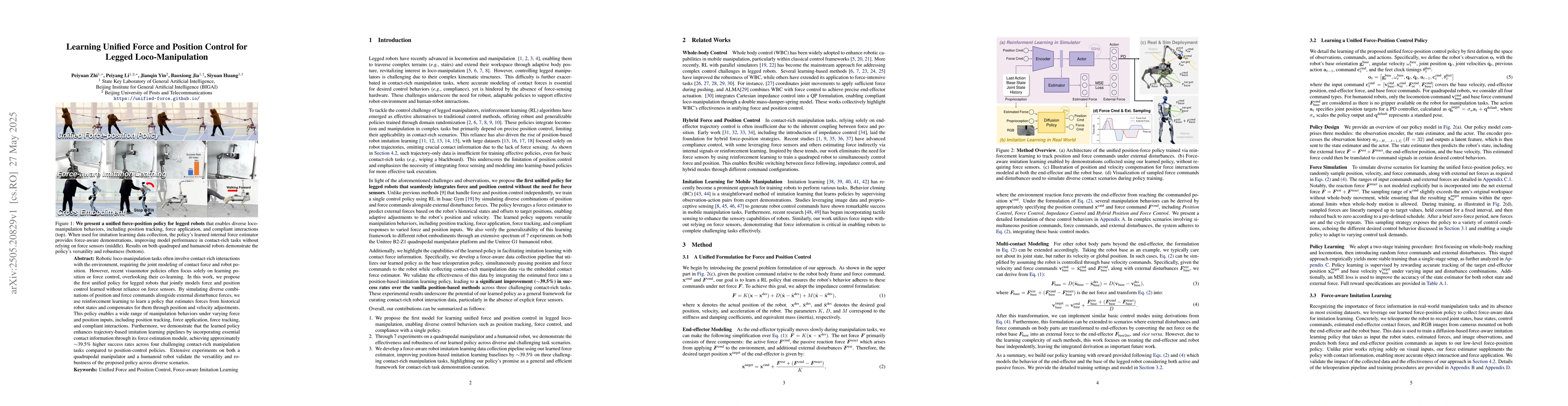 Researchers developed a unified policy for legged robots to control both force and position without relying on force sensors, achieving 39.5% higher success rates in contact-rich manipulation tasks.