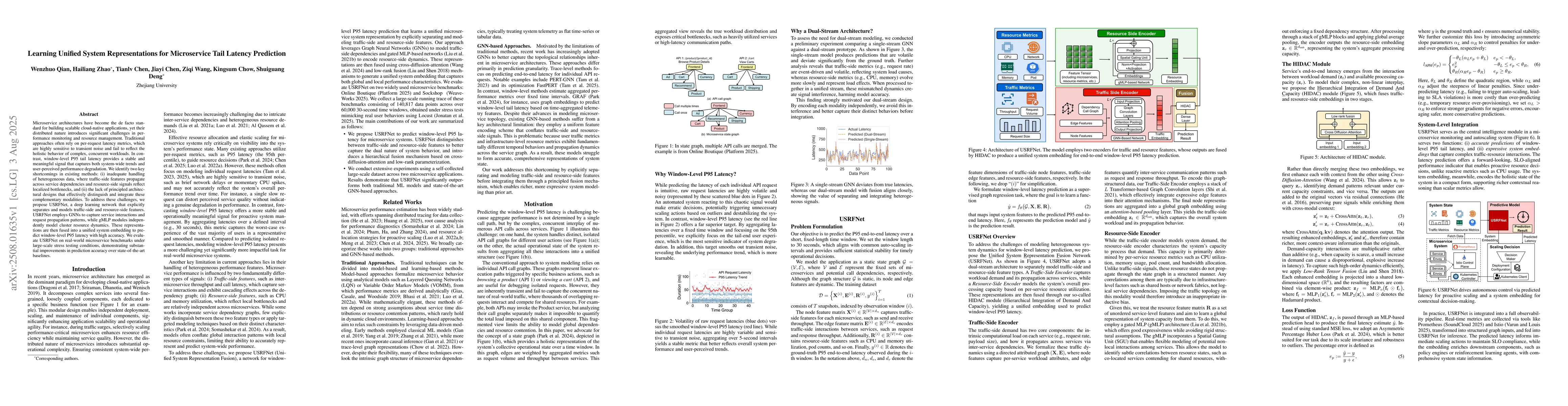 Microservice architectures have become the de facto standard for building scalable cloud-native applications, yet their distributed nature introduces significant challenges in performance monitoring and resource management. Traditional approaches often rely on per-request latency metrics, which are highly sensitive to transient noise and fail to reflect the holistic behavior of complex, concurrent workloads. In contrast, window-level P95 tail latency provides a stable and meaningful signal that captures both system-wide trends and user-perceived performance degradation. We identify two key shortcomings in existing methods: (i) inadequate handling of heterogeneous data, where traffic-side features propagate across service dependencies and resource-side signals reflect localized bottlenecks, and (ii) the lack of principled architectural designs that effectively distinguish and integrate these complementary modalities. To address these challenges, we propose USRFNet, a deep learning network that explicitly separates and models traffic-side and resource-side features. USRFNet employs GNNs to capture service interactions and request propagation patterns, while gMLP modules independently model cluster resource dynamics. These representations are then fused into a unified system embedding to predict window-level P95 latency with high accuracy. We evaluate USRFNet on real-world microservice benchmarks under large-scale stress testing conditions, demonstrating substantial improvements in prediction accuracy over state-of-the-art baselines.