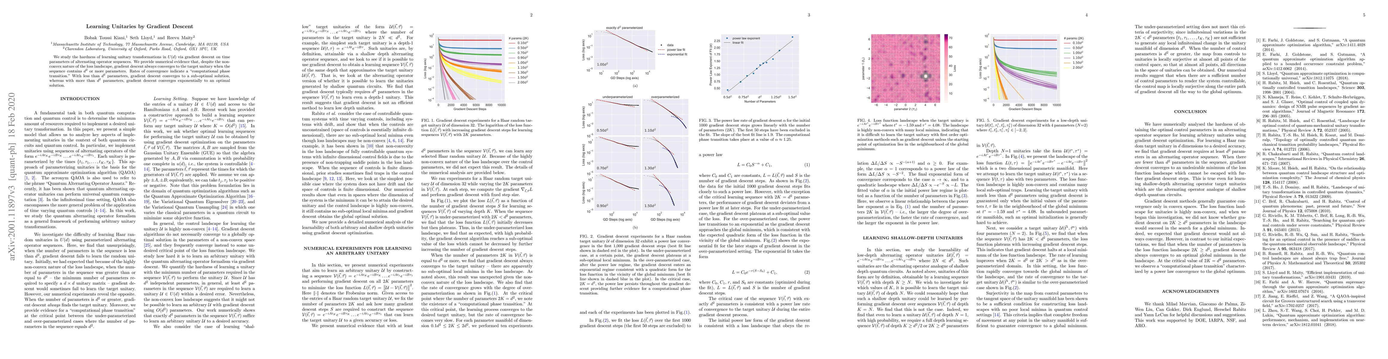 We study the hardness of learning unitary transformations in $U(d)$ via gradient descent on time parameters of alternating operator sequences. We provide numerical evidence that, despite the non-convex nature of the loss landscape, gradient descent always converges to the target unitary when the sequence contains $d^2$ or more parameters. Rates of convergence indicate a "computational phase transition." With less than $d^2$ parameters, gradient descent converges to a sub-optimal solution, whereas with more than $d^2$ parameters, gradient descent converges exponentially to an optimal solution.