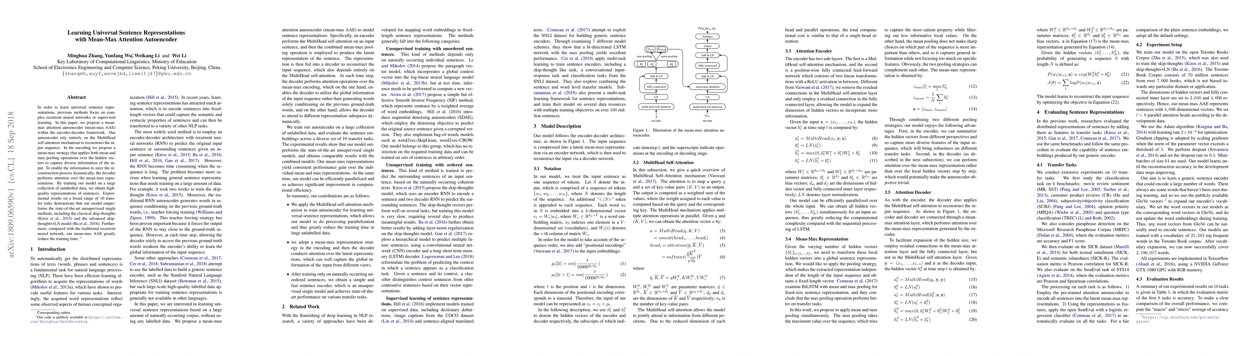 A new autoencoder model called mean-max AAE is proposed to learn universal sentence representations through a self-attention mechanism. It outperforms state-of-the-art unsupervised models on 10 transfer tasks and reduces training time compared to traditional recurrent neural networks.