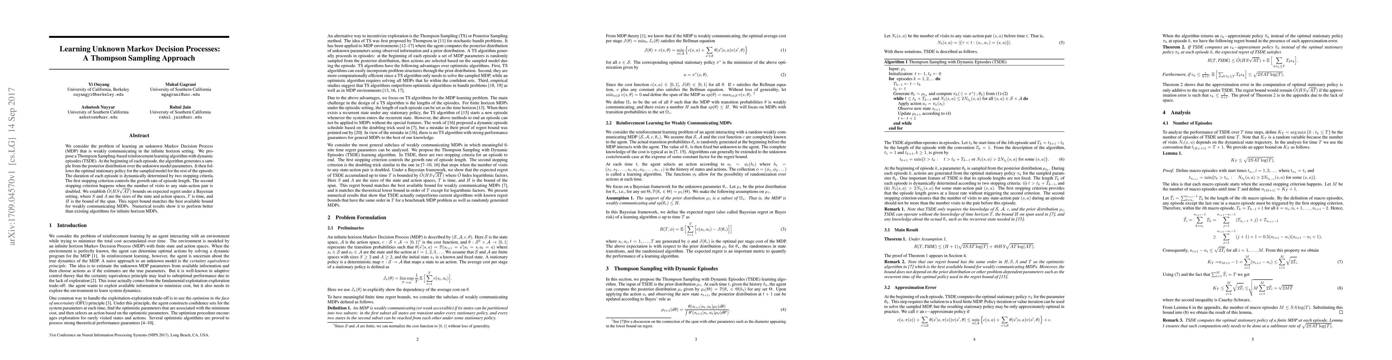 This paper proposes a Thompson Sampling-based reinforcement learning algorithm for learning unknown weakly communicating Markov Decision Processes (MDPs) in an infinite horizon. The algorithm dynamically adjusts episode lengths based on stopping criteria and achieves regret bounds comparable to the best existing methods, outperforming them in numerical evaluations.
