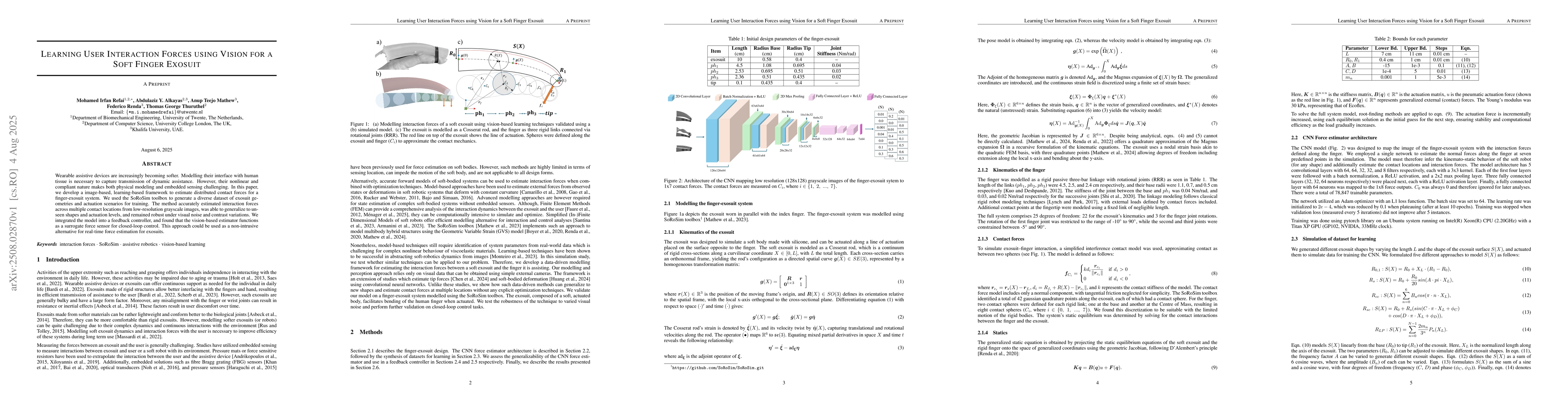 Wearable assistive devices are increasingly becoming softer. Modelling their interface with human tissue is necessary to capture transmission of dynamic assistance. However, their nonlinear and compliant nature makes both physical modeling and embedded sensing challenging. In this paper, we develop a image-based, learning-based framework to estimate distributed contact forces for a finger-exosuit system. We used the SoRoSim toolbox to generate a diverse dataset of exosuit geometries and actuation scenarios for training. The method accurately estimated interaction forces across multiple contact locations from low-resolution grayscale images, was able to generalize to unseen shapes and actuation levels, and remained robust under visual noise and contrast variations. We integrated the model into a feedback controller, and found that the vision-based estimator functions as a surrogate force sensor for closed-loop control. This approach could be used as a non-intrusive alternative for real-time force estimation for exosuits.