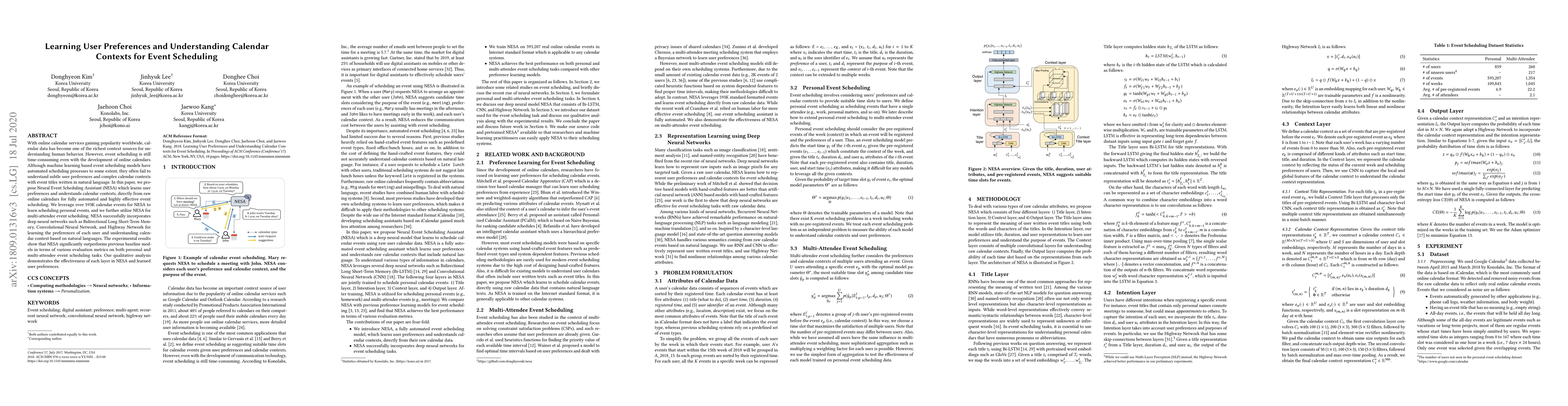 This paper introduces Neural Event Scheduling Assistant (NESA) to automate event scheduling by learning user preferences and understanding calendar contexts from raw online calendar data. NESA employs deep neural networks to outperform previous models, demonstrating significant improvements in both personal and multi-attendee event scheduling.