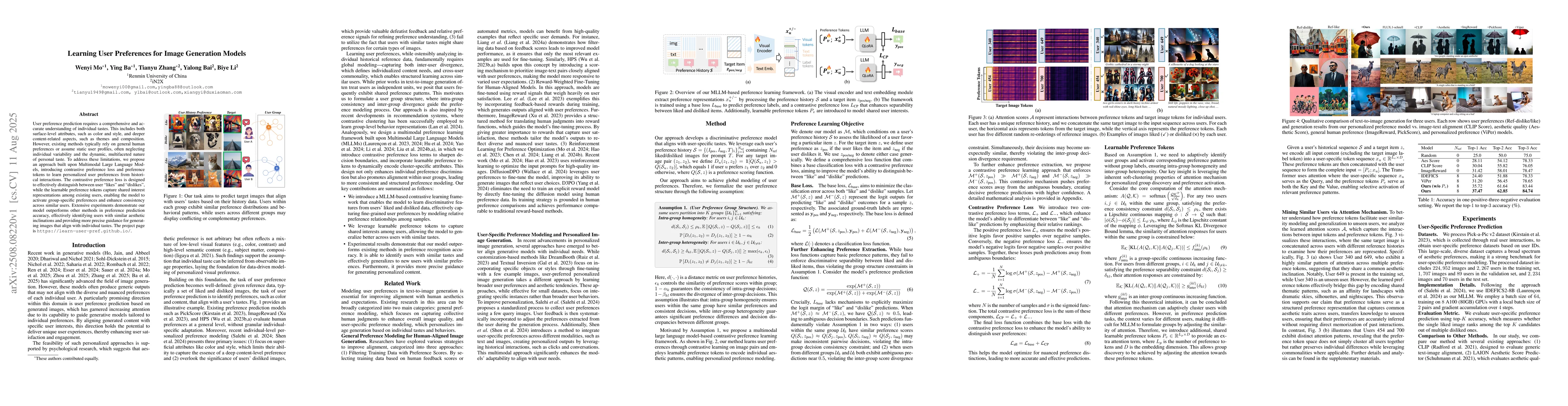 User preference prediction requires a comprehensive and accurate understanding of individual tastes. This includes both surface-level attributes, such as color and style, and deeper content-related aspects, such as themes and composition. However, existing methods typically rely on general human preferences or assume static user profiles, often neglecting individual variability and the dynamic, multifaceted nature of personal taste. To address these limitations, we propose an approach built upon Multimodal Large Language Models, introducing contrastive preference loss and preference tokens to learn personalized user preferences from historical interactions. The contrastive preference loss is designed to effectively distinguish between user ''likes'' and ''dislikes'', while the learnable preference tokens capture shared interest representations among existing users, enabling the model to activate group-specific preferences and enhance consistency across similar users. Extensive experiments demonstrate our model outperforms other methods in preference prediction accuracy, effectively identifying users with similar aesthetic inclinations and providing more precise guidance for generating images that align with individual tastes. The project page is \texttt{https://learn-user-pref.github.io/}.