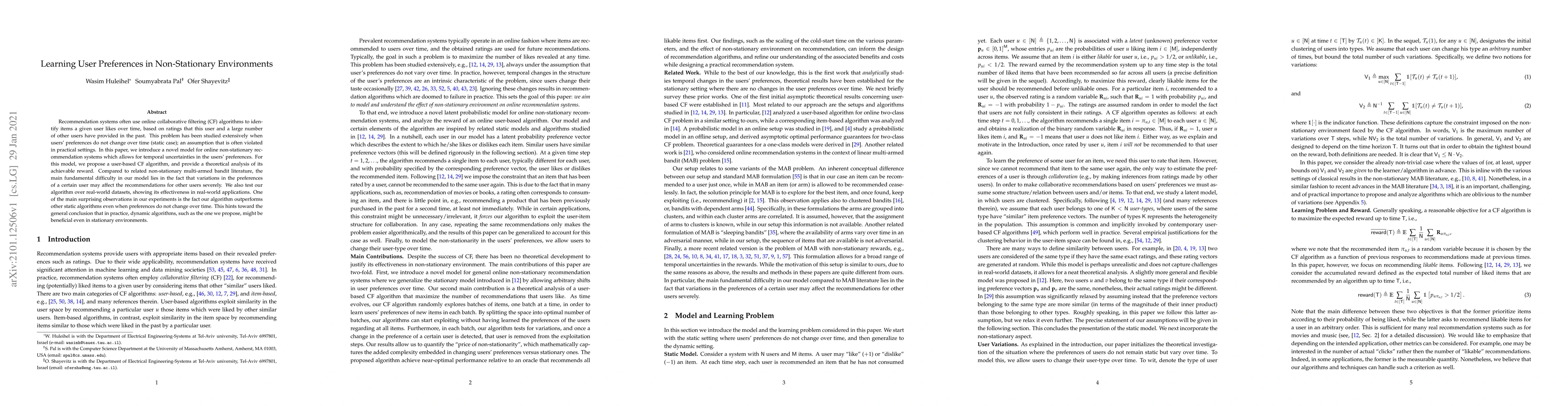 Recommendation systems often use online collaborative filtering (CF) algorithms to identify items a given user likes over time, based on ratings that this user and a large number of other users have provided in the past. This problem has been studied extensively when users' preferences do not change over time (static case); an assumption that is often violated in practical settings. In this paper, we introduce a novel model for online non-stationary recommendation systems which allows for temporal uncertainties in the users' preferences. For this model, we propose a user-based CF algorithm, and provide a theoretical analysis of its achievable reward. Compared to related non-stationary multi-armed bandit literature, the main fundamental difficulty in our model lies in the fact that variations in the preferences of a certain user may affect the recommendations for other users severely. We also test our algorithm over real-world datasets, showing its effectiveness in real-world applications. One of the main surprising observations in our experiments is the fact our algorithm outperforms other static algorithms even when preferences do not change over time. This hints toward the general conclusion that in practice, dynamic algorithms, such as the one we propose, might be beneficial even in stationary environments.