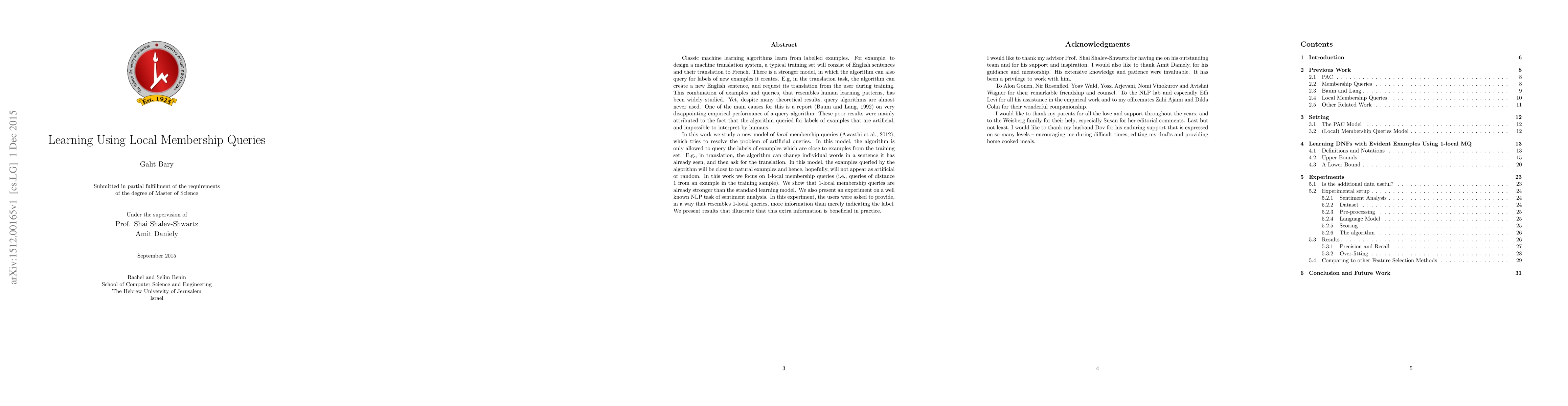 This paper explores the efficacy of 1-local membership queries in machine learning, where the algorithm can only query labels of examples close to training set instances. The authors argue that this model avoids artificial queries, potentially leading to better empirical performance compared to traditional methods. They demonstrate this through an NLP sentiment analysis experiment, showing that additional human-provided information aids practical learning outcomes.