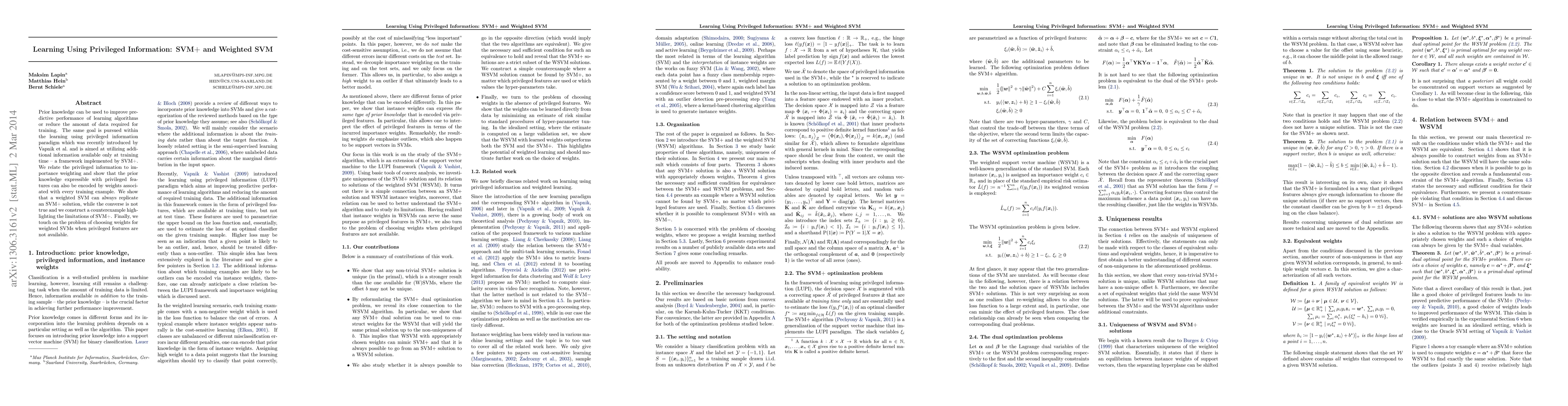 This paper explores the use of privileged information to enhance learning algorithms, specifically through SVM+ and weighted SVM approaches. It demonstrates that weighted SVM can replicate SVM+ solutions but not vice versa, highlighting SVM+'s limitations and discussing the challenge of selecting weights in the absence of privileged features.