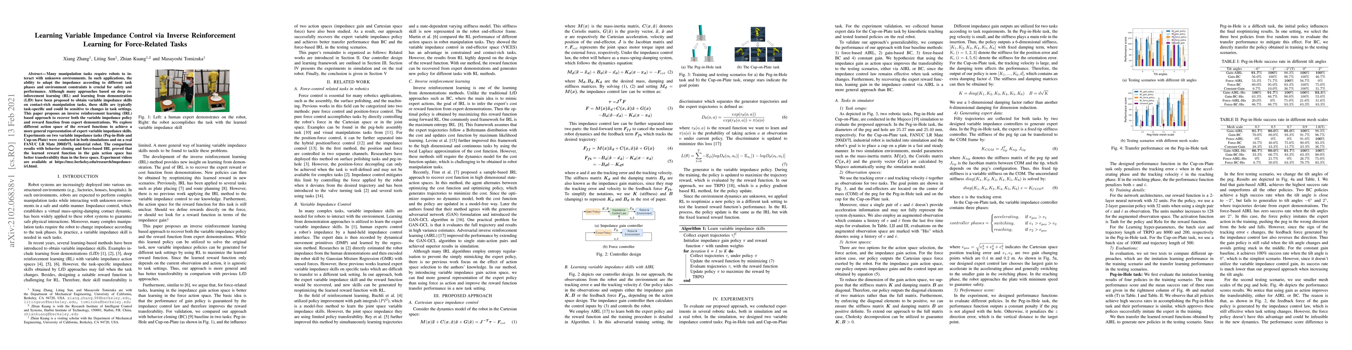 This paper proposes an inverse reinforcement learning (IRL) approach to derive variable impedance control policies from expert demonstrations, aiming for better adaptability and generalizability in manipulation tasks. Experiments on Peg-in-Hole and Cup-on-Plate tasks show that the learned reward function in the gain action space outperforms force-based IRL in terms of transferability.