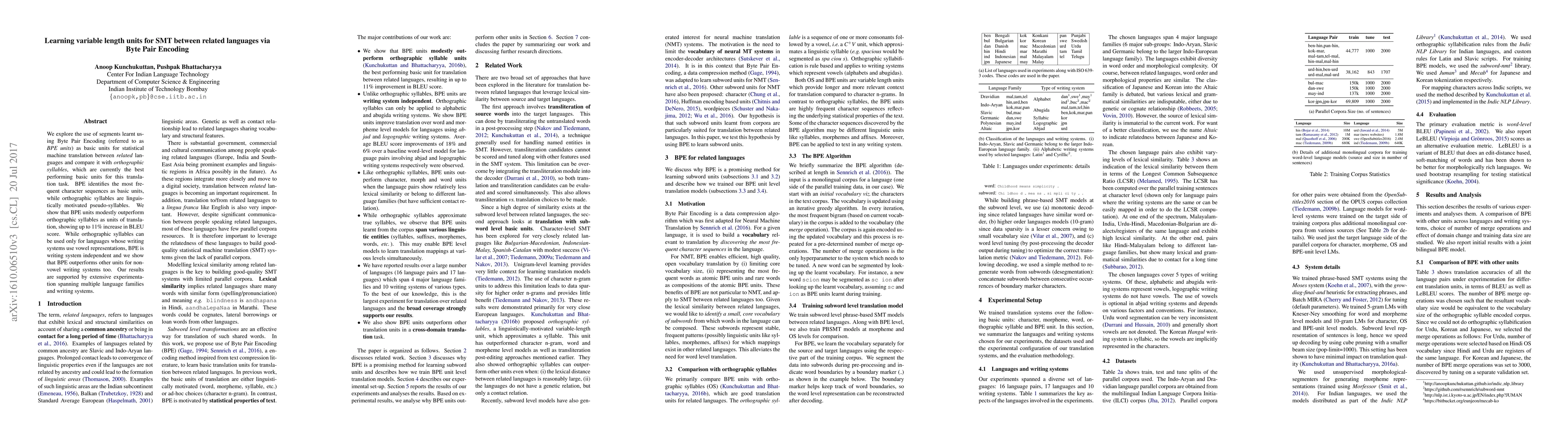 The research explores using Byte Pair Encoding (BPE) units as basic units for statistical machine translation (SMT) between related languages, comparing their performance with orthographic syllables. Experiments span multiple language families and writing systems.