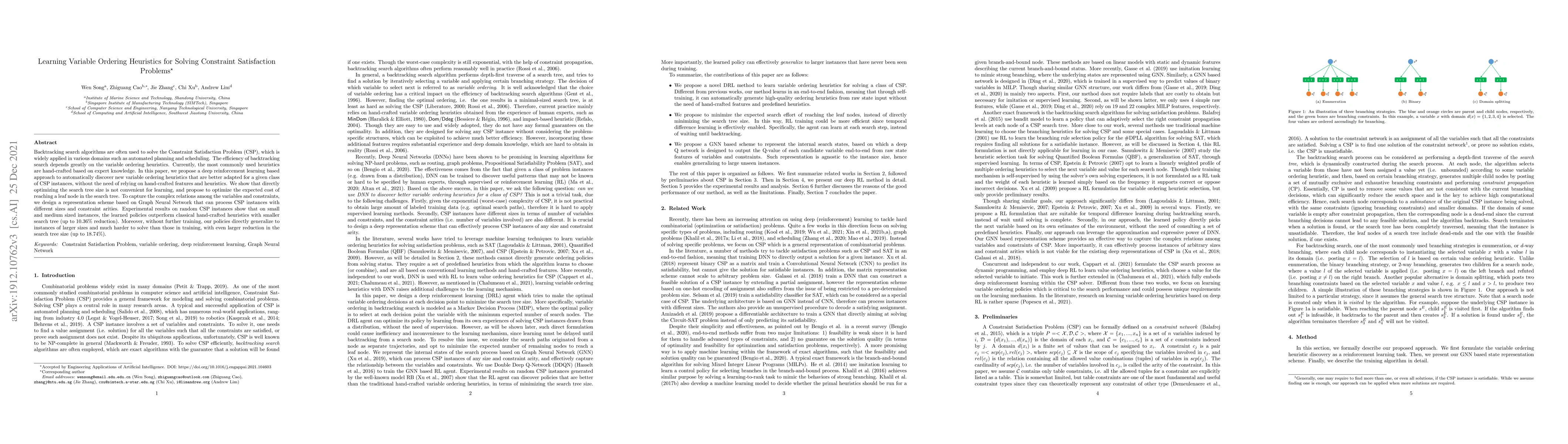 This paper proposes a deep reinforcement learning method to automatically discover variable ordering heuristics for solving Constraint Satisfaction Problems (CSP). The approach optimizes the expected cost of reaching a leaf node in the search tree, using a Graph Neural Network to represent CSP instances, and demonstrates superior performance over traditional heuristics.