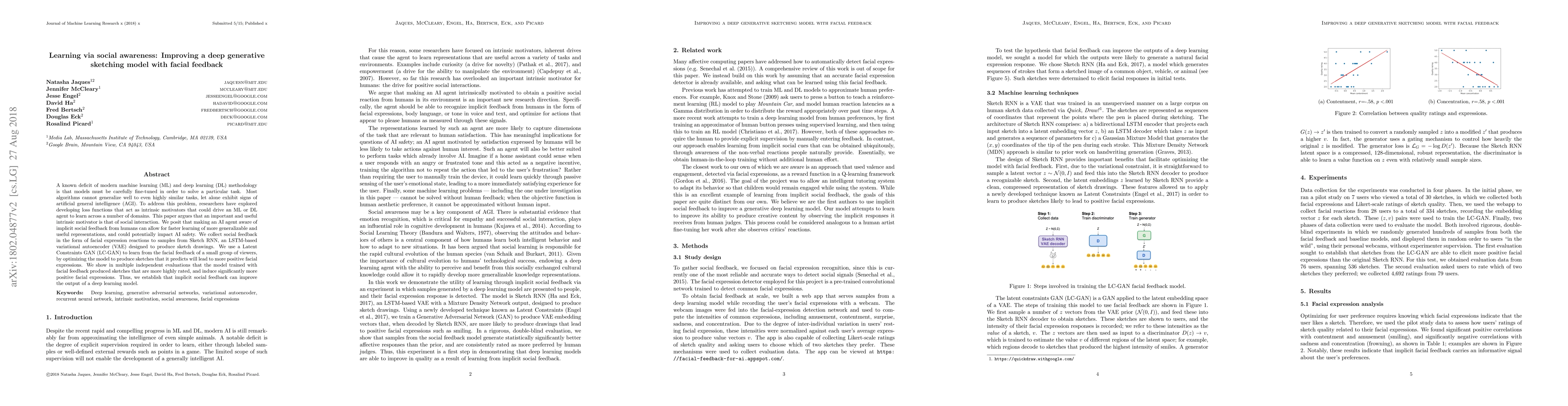 In the quest towards general artificial intelligence (AI), researchers have explored developing loss functions that act as intrinsic motivators in the absence of external rewards. This paper argues that such research has overlooked an important and useful intrinsic motivator: social interaction. We posit that making an AI agent aware of implicit social feedback from humans can allow for faster learning of more generalizable and useful representations, and could potentially impact AI safety. We collect social feedback in the form of facial expression reactions to samples from Sketch RNN, an LSTM-based variational autoencoder (VAE) designed to produce sketch drawings. We use a Latent Constraints GAN (LC-GAN) to learn from the facial feedback of a small group of viewers, by optimizing the model to produce sketches that it predicts will lead to more positive facial expressions. We show in multiple independent evaluations that the model trained with facial feedback produced sketches that are more highly rated, and induce significantly more positive facial expressions. Thus, we establish that implicit social feedback can improve the output of a deep learning model.