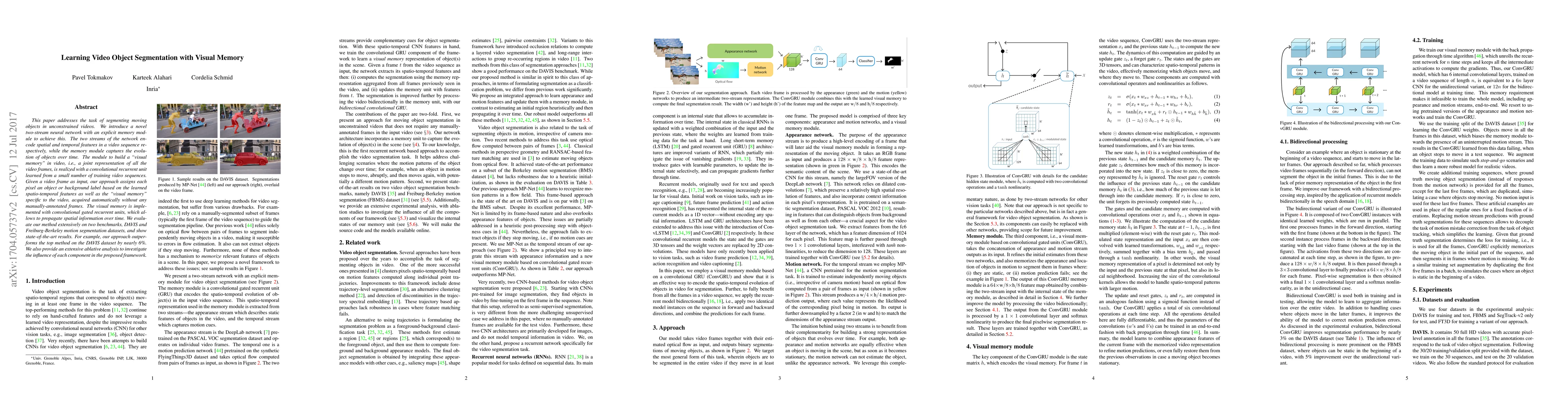 This paper proposes a two-stream neural network with an explicit memory module to segment moving objects in unconstrained videos, achieving state-of-the-art results on DAVIS and Freiburg-Berkeley datasets by incorporating a "visual memory" to capture object evolution over time. The method outperforms existing top methods by nearly 6% on the DAVIS dataset.