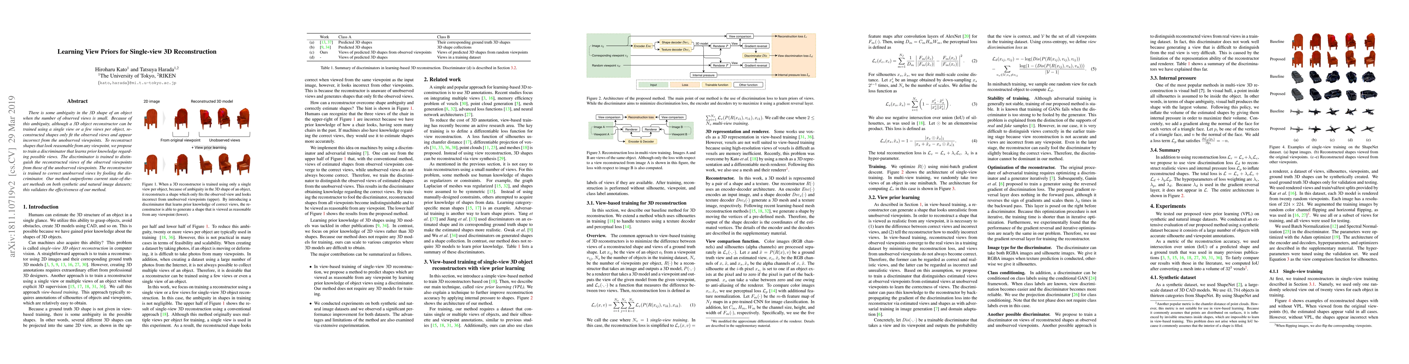 There is some ambiguity in the 3D shape of an object when the number of observed views is small. Because of this ambiguity, although a 3D object reconstructor can be trained using a single view or a few views per object, reconstructed shapes only fit the observed views and appear incorrect from the unobserved viewpoints. To reconstruct shapes that look reasonable from any viewpoint, we propose to train a discriminator that learns prior knowledge regarding possible views. The discriminator is trained to distinguish the reconstructed views of the observed viewpoints from those of the unobserved viewpoints. The reconstructor is trained to correct unobserved views by fooling the discriminator. Our method outperforms current state-of-the-art methods on both synthetic and natural image datasets; this validates the effectiveness of our method.