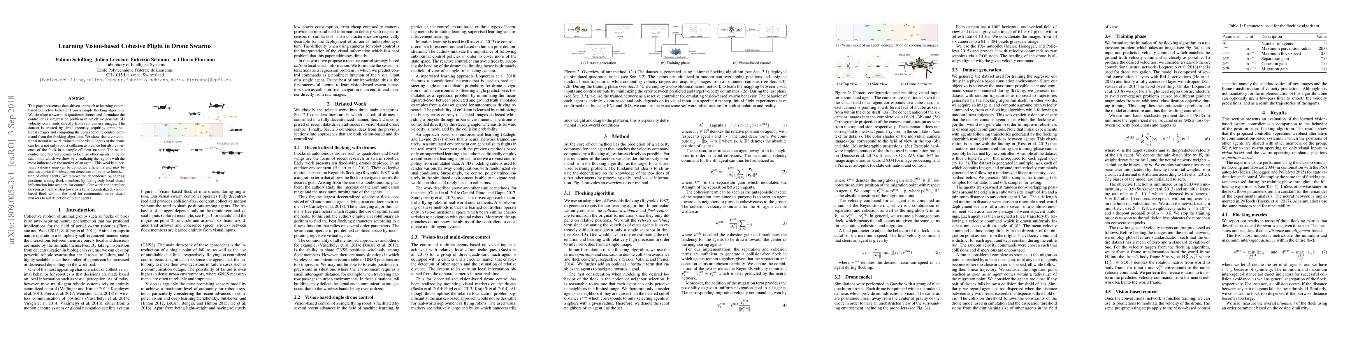 This paper develops a data-driven method for teaching drones in swarms to exhibit cohesive flight using only vision, leveraging a convolutional neural network trained on raw camera images to generate 3D velocity commands. The approach eliminates the need for inter-drone communication or visual markers, achieving robust collision avoidance and flock coherence.