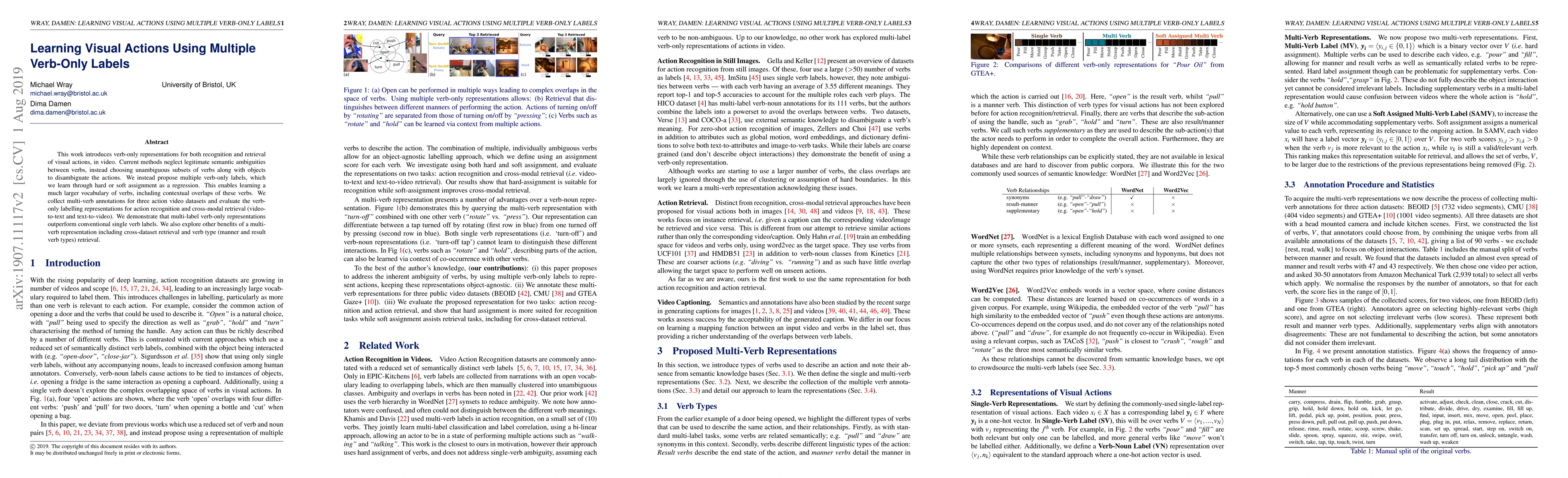 This work introduces verb-only representations for both recognition and retrieval of visual actions, in video. Current methods neglect legitimate semantic ambiguities between verbs, instead choosing unambiguous subsets of verbs along with objects to disambiguate the actions. We instead propose multiple verb-only labels, which we learn through hard or soft assignment as a regression. This enables learning a much larger vocabulary of verbs, including contextual overlaps of these verbs. We collect multi-verb annotations for three action video datasets and evaluate the verb-only labelling representations for action recognition and cross-modal retrieval (video-to-text and text-to-video). We demonstrate that multi-label verb-only representations outperform conventional single verb labels. We also explore other benefits of a multi-verb representation including cross-dataset retrieval and verb type manner and result verb types) retrieval.