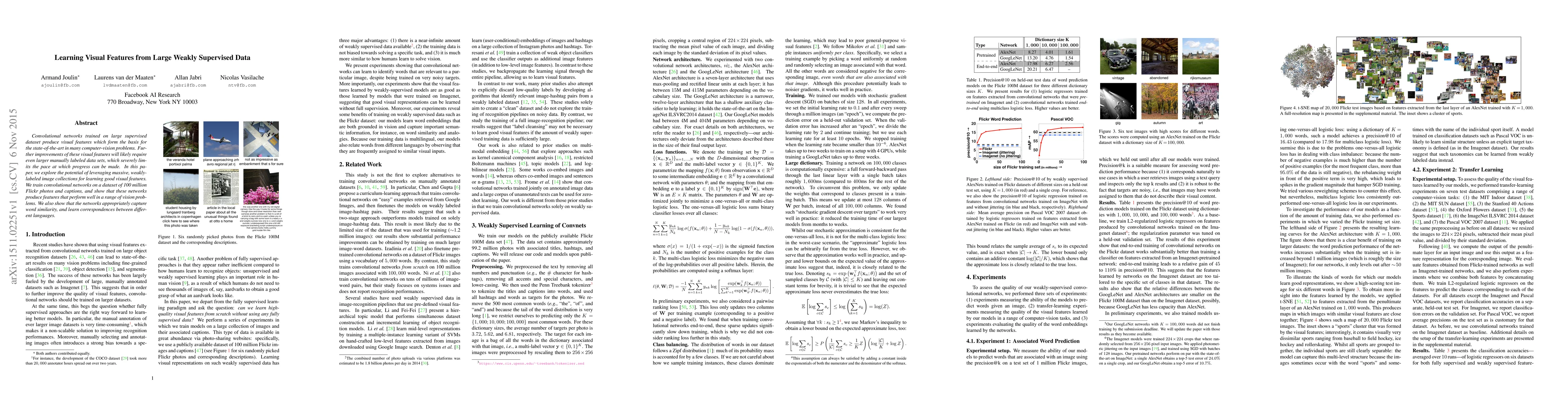 This paper investigates using large, weakly-labeled datasets to train convolutional networks for learning visual features, demonstrating that networks trained on 100 million Flickr photos and captions produce effective features for various computer vision tasks and capture word similarity.