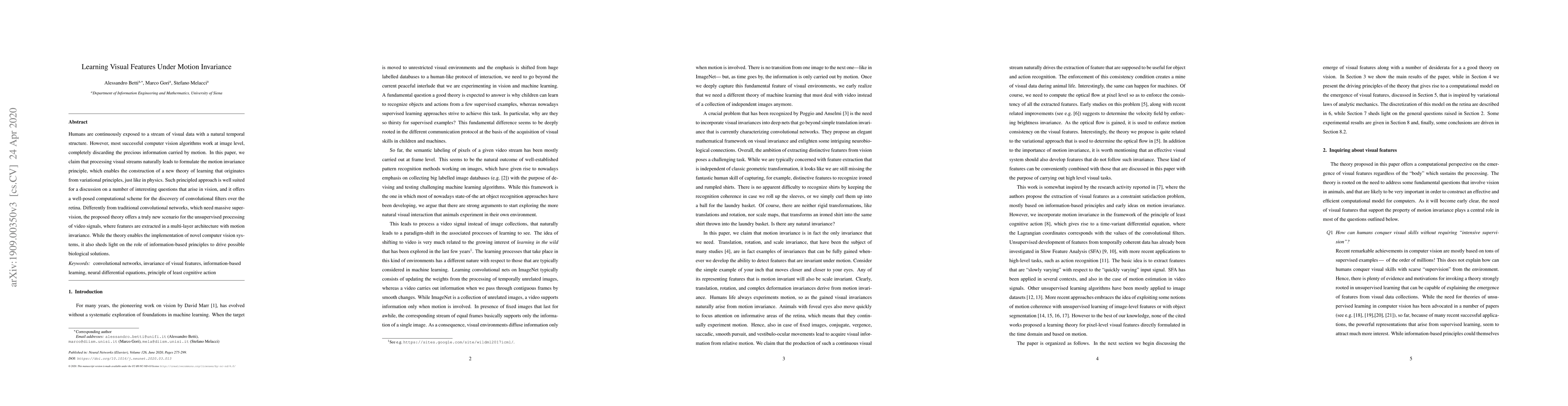 This paper proposes a new theory of learning visual features from motion-invariant visual streams, inspired by physics' variational principles. It introduces an unsupervised, multi-layer architecture for feature extraction in video signals, contrasting with supervised traditional convolutional networks, and suggests implications for both computer vision systems and potential biological solutions.