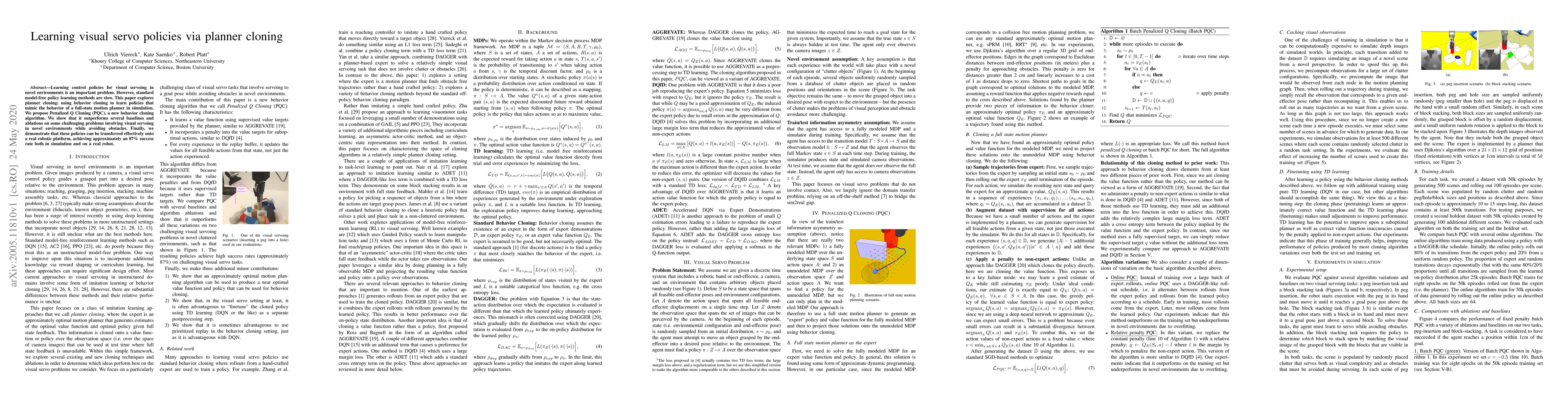 Learning control policies for visual servoing in novel environments is an important problem. However, standard model-free policy learning methods are slow. This paper explores planner cloning: using behavior cloning to learn policies that mimic the behavior of a full-state motion planner in simulation. We propose Penalized Q Cloning (PQC), a new behavior cloning algorithm. We show that it outperforms several baselines and ablations on some challenging problems involving visual servoing in novel environments while avoiding obstacles. Finally, we demonstrate that these policies can be transferred effectively onto a real robotic platform, achieving approximately an 87% success rate both in simulation and on a real robot.