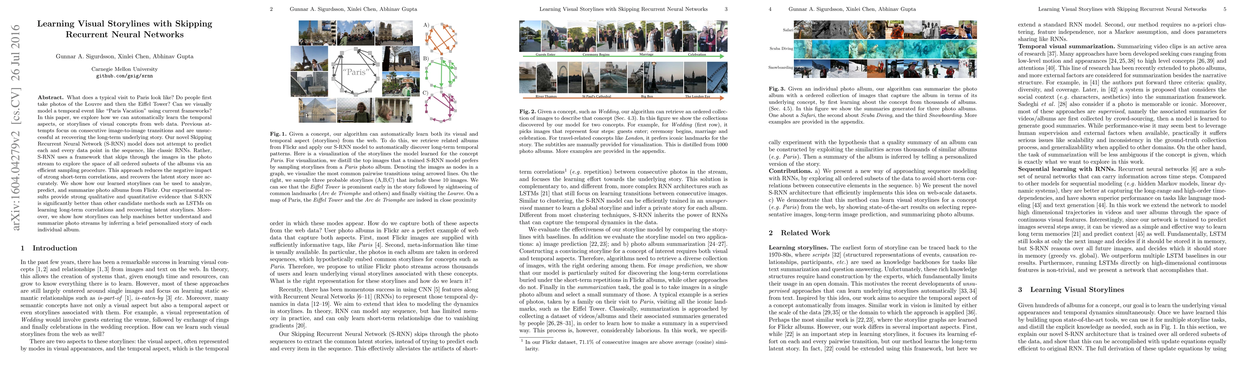 What does a typical visit to Paris look like? Do people first take photos of the Louvre and then the Eiffel Tower? Can we visually model a temporal event like "Paris Vacation" using current frameworks? In this paper, we explore how we can automatically learn the temporal aspects, or storylines of visual concepts from web data. Previous attempts focus on consecutive image-to-image transitions and are unsuccessful at recovering the long-term underlying story. Our novel Skipping Recurrent Neural Network (S-RNN) model does not attempt to predict each and every data point in the sequence, like classic RNNs. Rather, S-RNN uses a framework that skips through the images in the photo stream to explore the space of all ordered subsets of the albums via an efficient sampling procedure. This approach reduces the negative impact of strong short-term correlations, and recovers the latent story more accurately. We show how our learned storylines can be used to analyze, predict, and summarize photo albums from Flickr. Our experimental results provide strong qualitative and quantitative evidence that S-RNN is significantly better than other candidate methods such as LSTMs on learning long-term correlations and recovering latent storylines. Moreover, we show how storylines can help machines better understand and summarize photo streams by inferring a brief personalized story of each individual album.