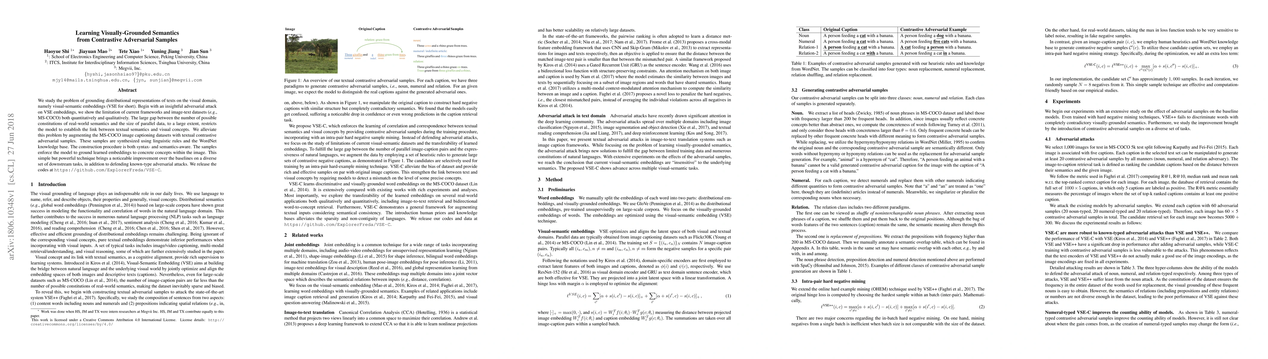 We study the problem of grounding distributional representations of texts on the visual domain, namely visual-semantic embeddings (VSE for short). Begin with an insightful adversarial attack on VSE embeddings, we show the limitation of current frameworks and image-text datasets (e.g., MS-COCO) both quantitatively and qualitatively. The large gap between the number of possible constitutions of real-world semantics and the size of parallel data, to a large extent, restricts the model to establish the link between textual semantics and visual concepts. We alleviate this problem by augmenting the MS-COCO image captioning datasets with textual contrastive adversarial samples. These samples are synthesized using linguistic rules and the WordNet knowledge base. The construction procedure is both syntax- and semantics-aware. The samples enforce the model to ground learned embeddings to concrete concepts within the image. This simple but powerful technique brings a noticeable improvement over the baselines on a diverse set of downstream tasks, in addition to defending known-type adversarial attacks. We release the codes at https://github.com/ExplorerFreda/VSE-C.