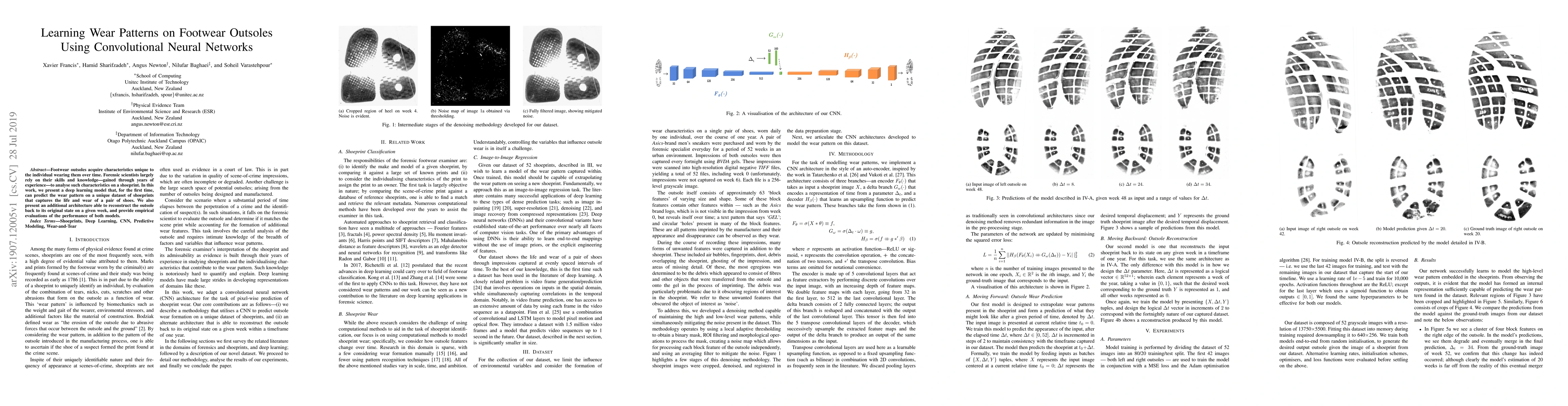 Footwear outsoles acquire characteristics unique to the individual wearing them over time. Forensic scientists largely rely on their skills and knowledge, gained through years of experience, to analyse such characteristics on a shoeprint. In this work, we present a convolutional neural network model that can predict the wear pattern on a unique dataset of shoeprints that captures the life and wear of a pair of shoes. We present an additional architecture able to reconstruct the outsole back to its original state on a given week, and provide empirical evaluations of the performance of both models.