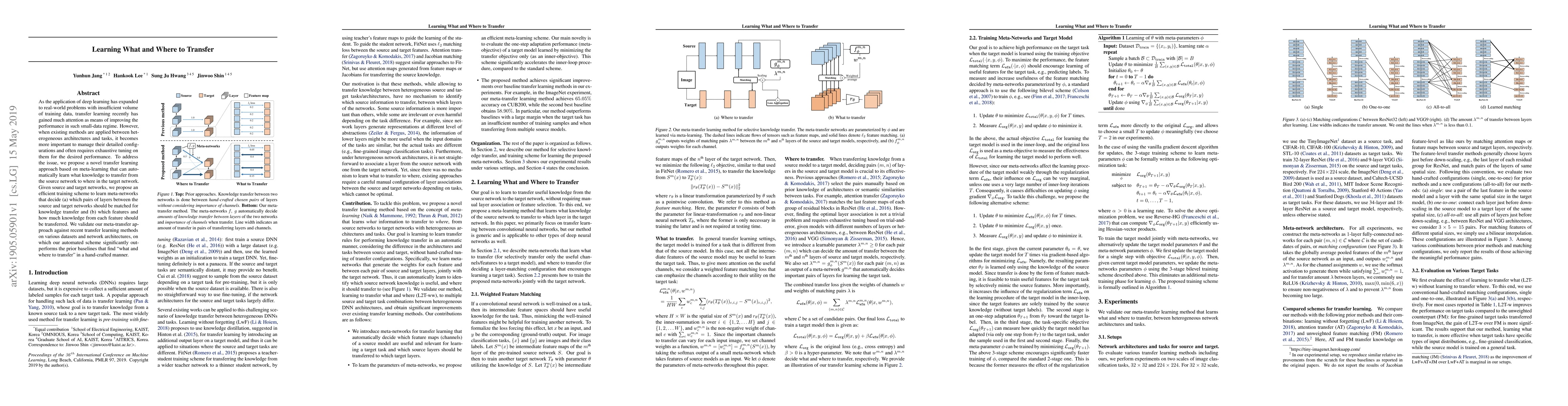 As the application of deep learning has expanded to real-world problems with insufficient volume of training data, transfer learning recently has gained much attention as means of improving the performance in such small-data regime. However, when existing methods are applied between heterogeneous architectures and tasks, it becomes more important to manage their detailed configurations and often requires exhaustive tuning on them for the desired performance. To address the issue, we propose a novel transfer learning approach based on meta-learning that can automatically learn what knowledge to transfer from the source network to where in the target network. Given source and target networks, we propose an efficient training scheme to learn meta-networks that decide (a) which pairs of layers between the source and target networks should be matched for knowledge transfer and (b) which features and how much knowledge from each feature should be transferred. We validate our meta-transfer approach against recent transfer learning methods on various datasets and network architectures, on which our automated scheme significantly outperforms the prior baselines that find "what and where to transfer" in a hand-crafted manner.