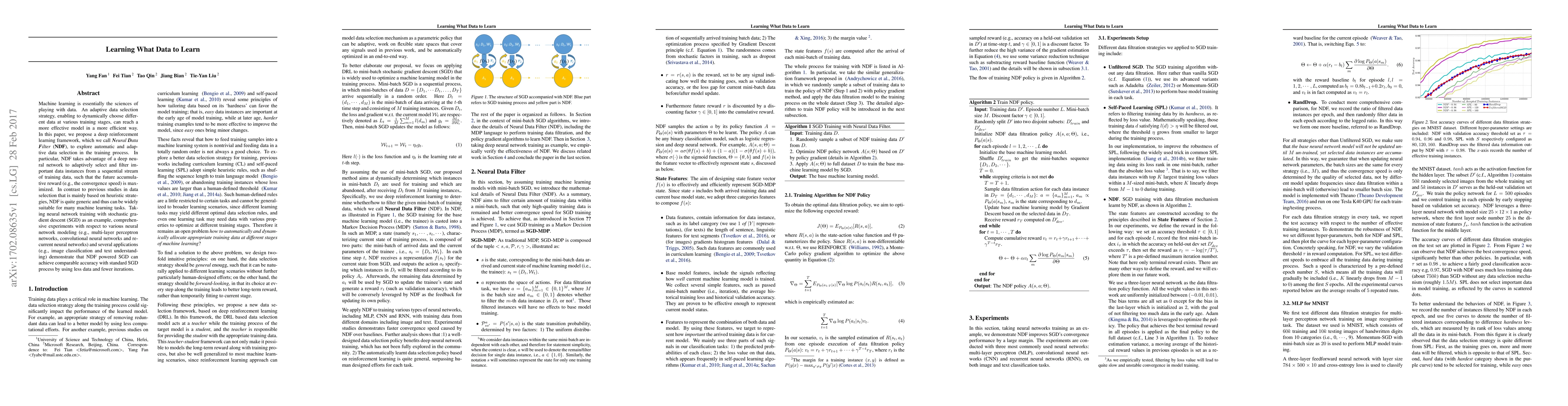 Machine learning is essentially the sciences of playing with data. An adaptive data selection strategy, enabling to dynamically choose different data at various training stages, can reach a more effective model in a more efficient way. In this paper, we propose a deep reinforcement learning framework, which we call \emph{\textbf{N}eural \textbf{D}ata \textbf{F}ilter} (\textbf{NDF}), to explore automatic and adaptive data selection in the training process. In particular, NDF takes advantage of a deep neural network to adaptively select and filter important data instances from a sequential stream of training data, such that the future accumulative reward (e.g., the convergence speed) is maximized. In contrast to previous studies in data selection that is mainly based on heuristic strategies, NDF is quite generic and thus can be widely suitable for many machine learning tasks. Taking neural network training with stochastic gradient descent (SGD) as an example, comprehensive experiments with respect to various neural network modeling (e.g., multi-layer perceptron networks, convolutional neural networks and recurrent neural networks) and several applications (e.g., image classification and text understanding) demonstrate that NDF powered SGD can achieve comparable accuracy with standard SGD process by using less data and fewer iterations.