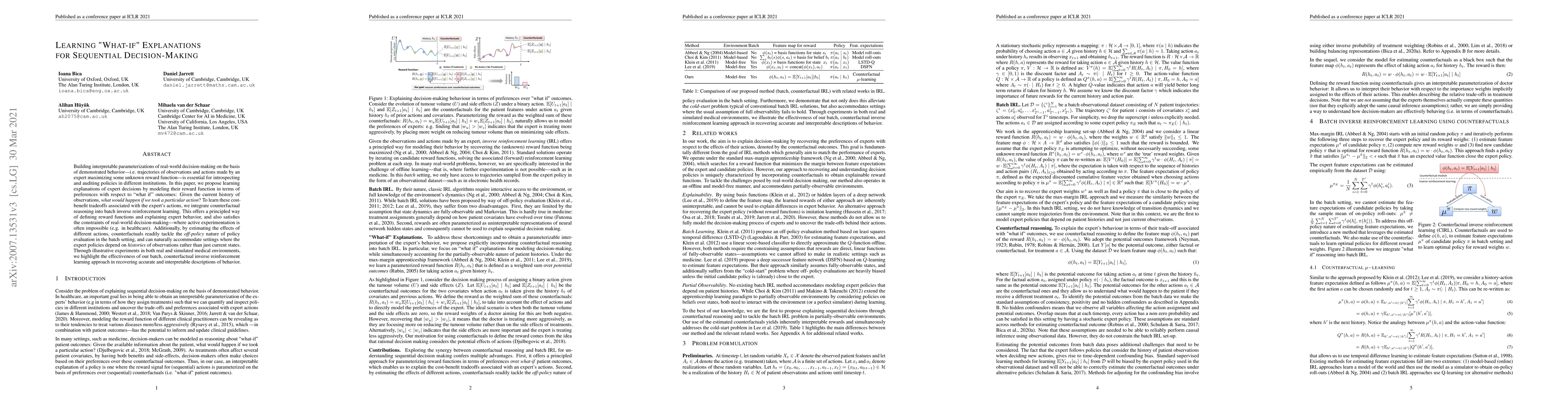 Building interpretable parameterizations of real-world decision-making on the basis of demonstrated behavior -- i.e. trajectories of observations and actions made by an expert maximizing some unknown reward function -- is essential for introspecting and auditing policies in different institutions. In this paper, we propose learning explanations of expert decisions by modeling their reward function in terms of preferences with respect to "what if" outcomes: Given the current history of observations, what would happen if we took a particular action? To learn these cost-benefit tradeoffs associated with the expert's actions, we integrate counterfactual reasoning into batch inverse reinforcement learning. This offers a principled way of defining reward functions and explaining expert behavior, and also satisfies the constraints of real-world decision-making -- where active experimentation is often impossible (e.g. in healthcare). Additionally, by estimating the effects of different actions, counterfactuals readily tackle the off-policy nature of policy evaluation in the batch setting, and can naturally accommodate settings where the expert policies depend on histories of observations rather than just current states. Through illustrative experiments in both real and simulated medical environments, we highlight the effectiveness of our batch, counterfactual inverse reinforcement learning approach in recovering accurate and interpretable descriptions of behavior.