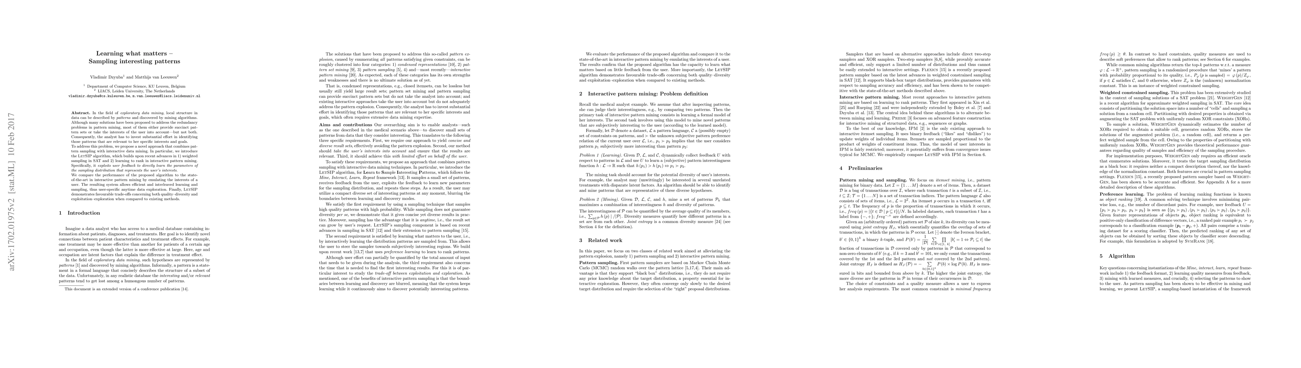 In the field of exploratory data mining, local structure in data can be described by patterns and discovered by mining algorithms. Although many solutions have been proposed to address the redundancy problems in pattern mining, most of them either provide succinct pattern sets or take the interests of the user into account-but not both. Consequently, the analyst has to invest substantial effort in identifying those patterns that are relevant to her specific interests and goals. To address this problem, we propose a novel approach that combines pattern sampling with interactive data mining. In particular, we introduce the LetSIP algorithm, which builds upon recent advances in 1) weighted sampling in SAT and 2) learning to rank in interactive pattern mining. Specifically, it exploits user feedback to directly learn the parameters of the sampling distribution that represents the user's interests. We compare the performance of the proposed algorithm to the state-of-the-art in interactive pattern mining by emulating the interests of a user. The resulting system allows efficient and interleaved learning and sampling, thus user-specific anytime data exploration. Finally, LetSIP demonstrates favourable trade-offs concerning both quality-diversity and exploitation-exploration when compared to existing methods.