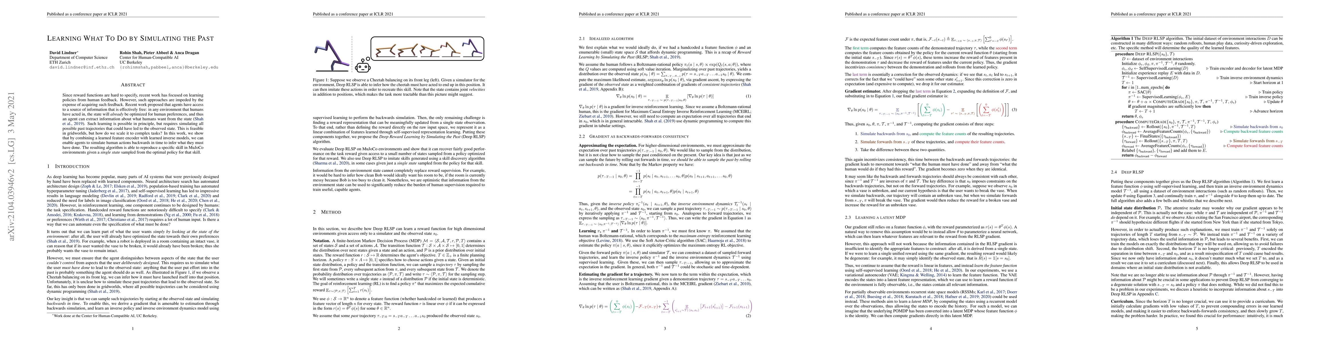 This paper proposes a method for learning policies by simulating human actions backwards in complex environments, leveraging a learned feature encoder and inverse models to infer human preferences from observed states. The approach enables agents to reproduce specific skills in MuJoCo environments using only a single state from the optimal policy.