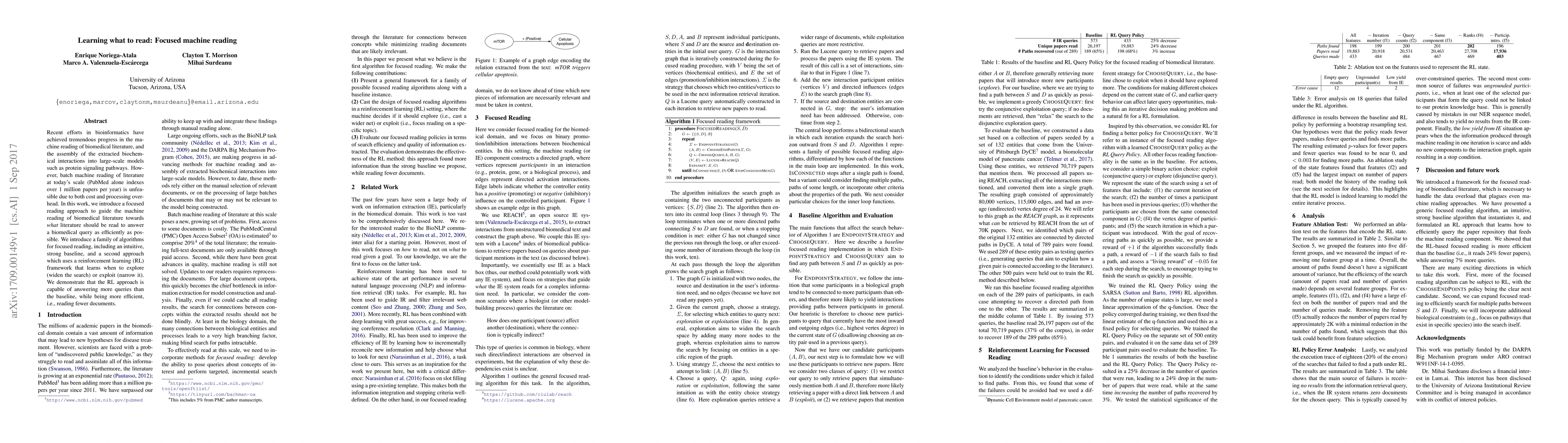 This paper proposes a focused machine reading approach to efficiently extract biochemical interactions from biomedical literature. It introduces algorithms that guide machine reading to prioritize relevant literature for answering specific queries, demonstrating that a reinforcement learning-based approach can answer more queries efficiently than traditional methods.