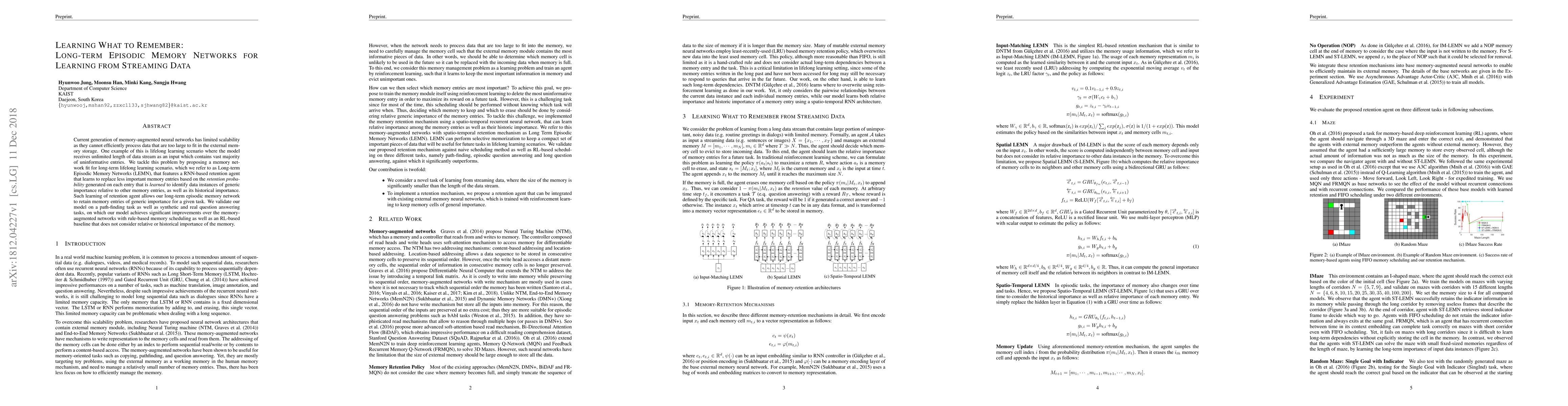 This paper proposes Long-term Episodic Memory Networks (LEMN) to address the scalability issues of memory-augmented neural networks in lifelong learning scenarios. LEMN uses a RNN-based retention agent to prioritize and retain important memory entries, achieving significant improvements over existing memory-augmented networks in path-finding and question answering tasks.