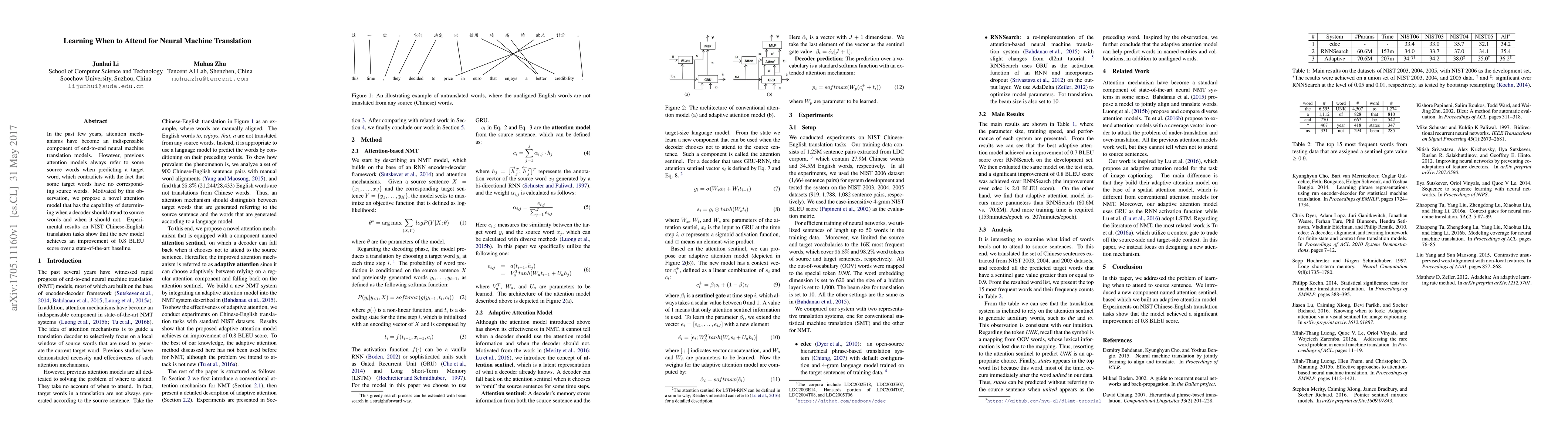 This paper proposes a novel attention mechanism for neural machine translation that determines when the decoder should attend to source words, improving translation accuracy when target words lack corresponding source words. The new model achieves a 0.8 BLEU score improvement over a state-of-the-art baseline on NIST Chinese-English translation tasks.
