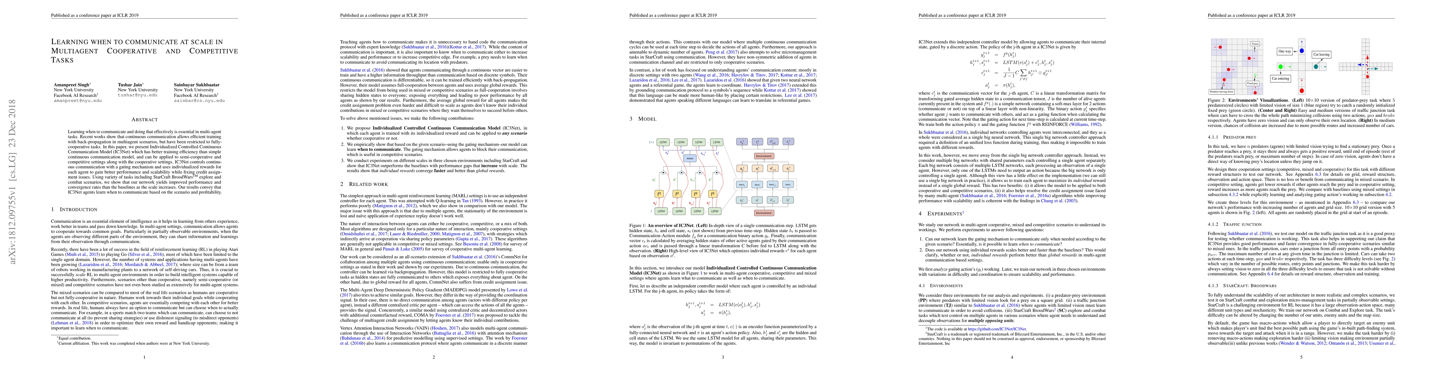 This paper introduces IC3Net, an Individualized Controlled Continuous Communication Model that enhances training efficiency in multi-agent tasks, particularly in semi-cooperative and competitive settings. It employs a gating mechanism to manage communication and individualized rewards to improve performance and scalability, demonstrating superior results in StarCraft BroodWars scenarios.