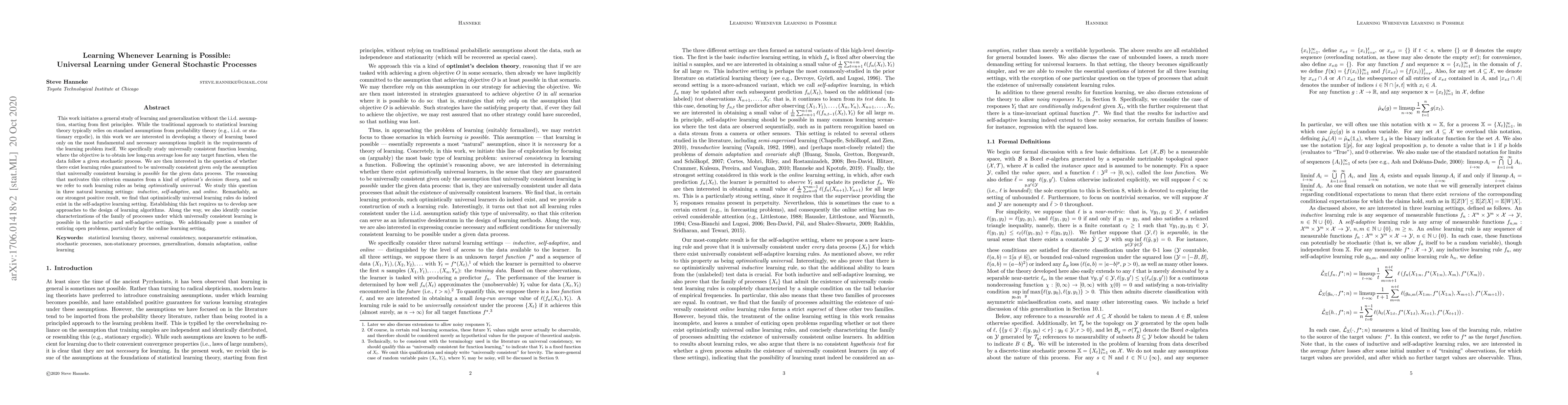 This paper explores learning theories without the i.i.d. assumption, focusing on universally consistent function learning under general stochastic processes. It finds optimistically universal learning rules exist in self-adaptive settings, necessitating new algorithmic approaches.